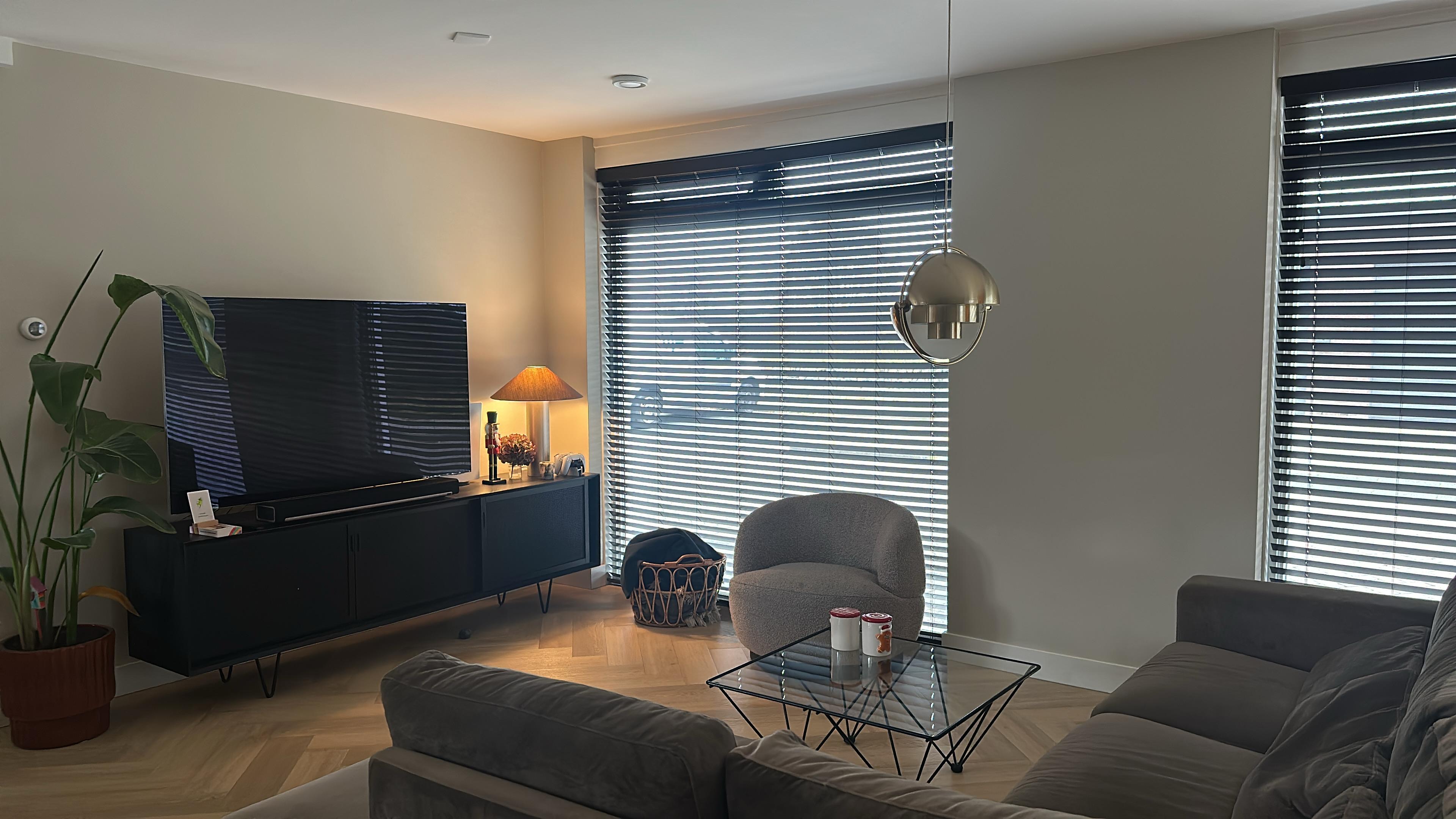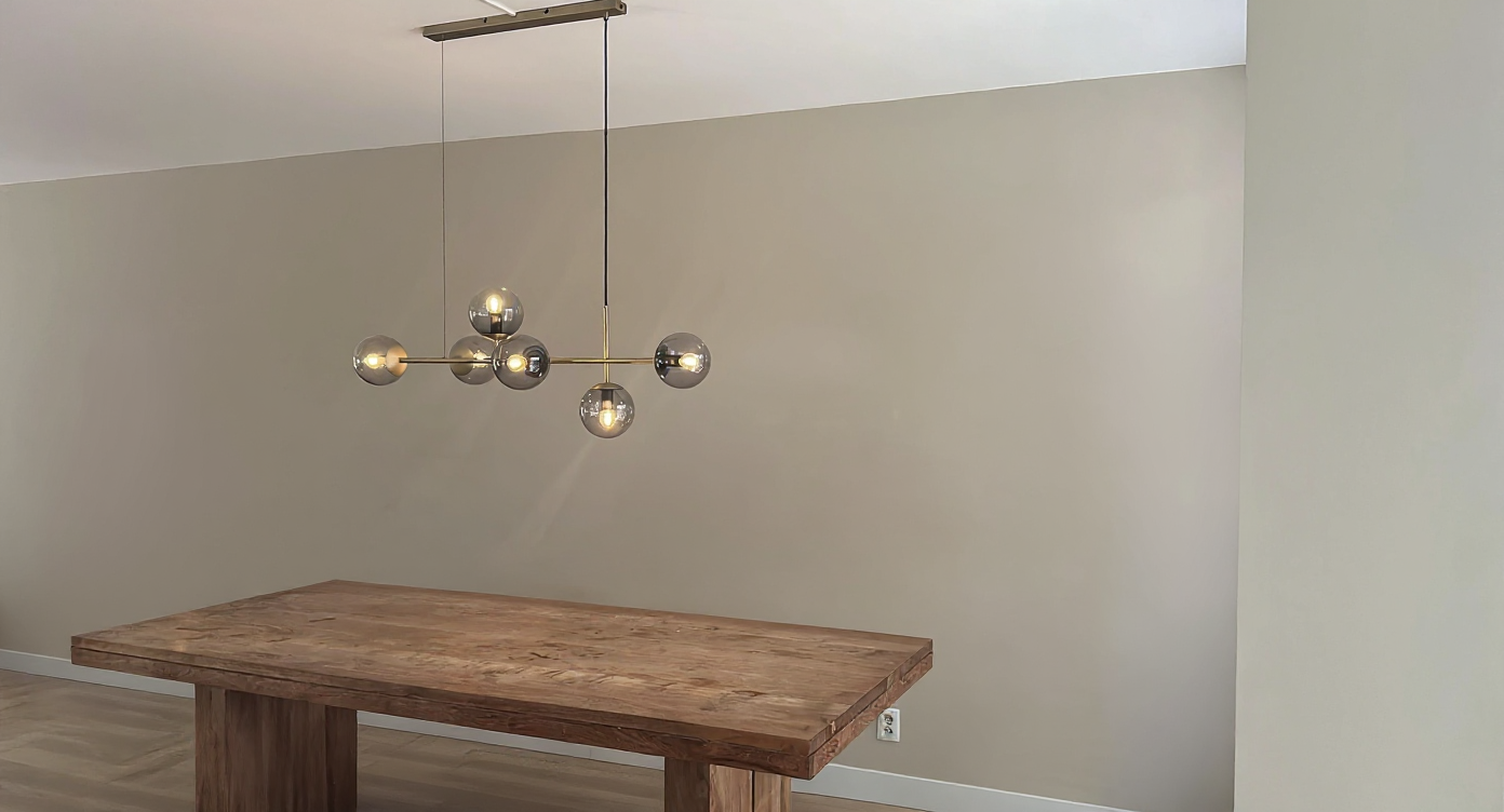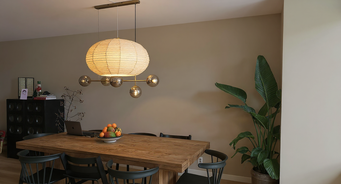 place abstract art on wall between windows remove hanging lamp and replace with rice paper lamp add big green rug under sofa