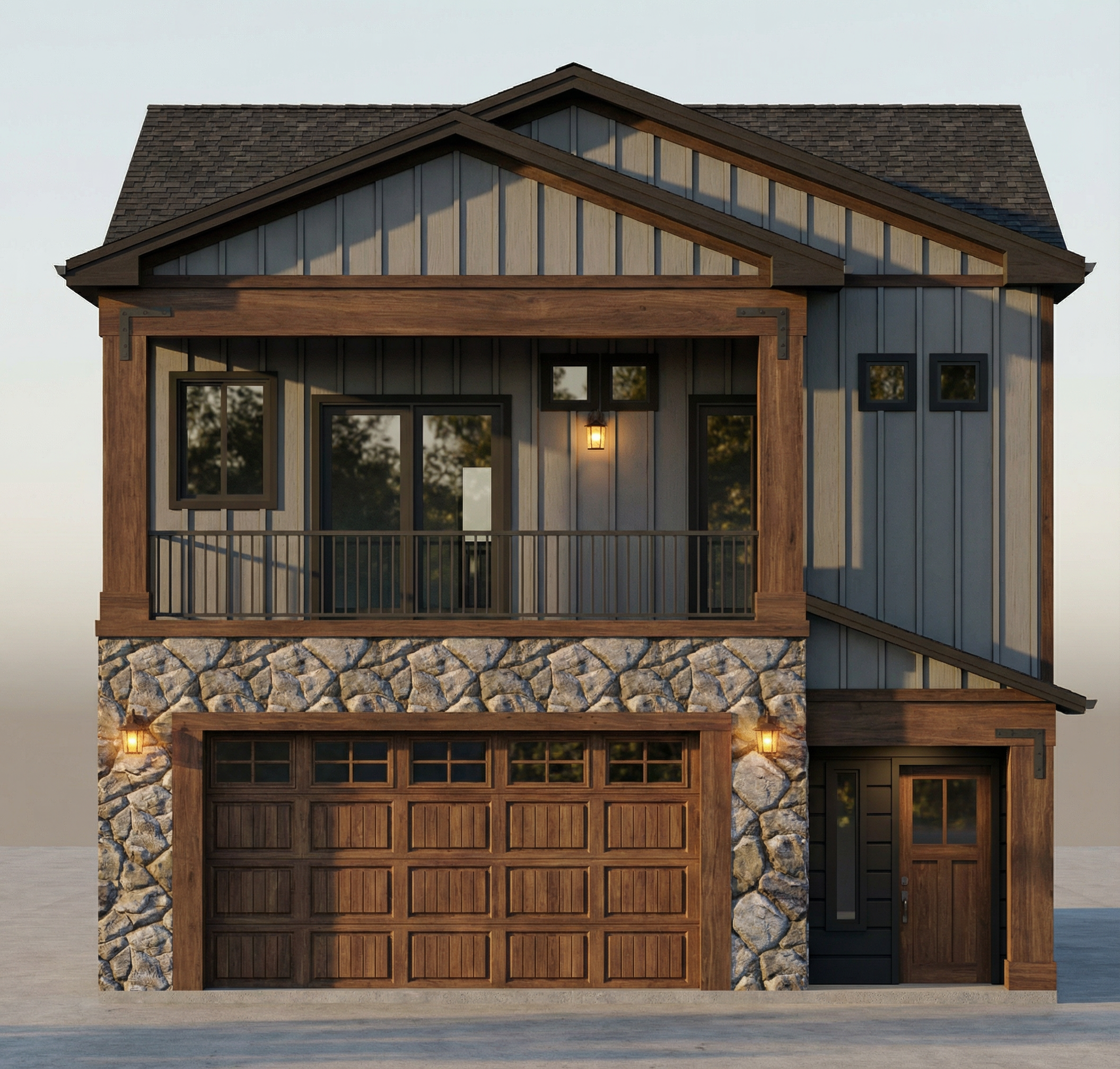 add stone and siding to the house finish the deck also with stone along the columns add gentle landscaping