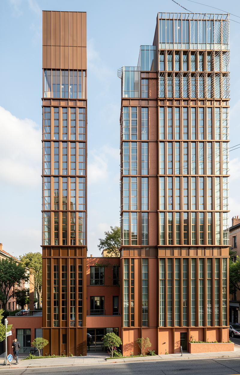 render an elegant modern living room featuring a high ceiling and a black chandelier with warm white lights the room has a cozy atmosphere with a large l shaped beige sofa adorned with soft gray and brown pillows a light wood coffee table sits atop a plush beige rug in the corner a green plant adds life near a textured brown ottoman the fireplace wall is marble with subtle gray veining above which hangs a television large black framed windows offer views of lush greenery the walls are a pristine white creating a serene inviting space