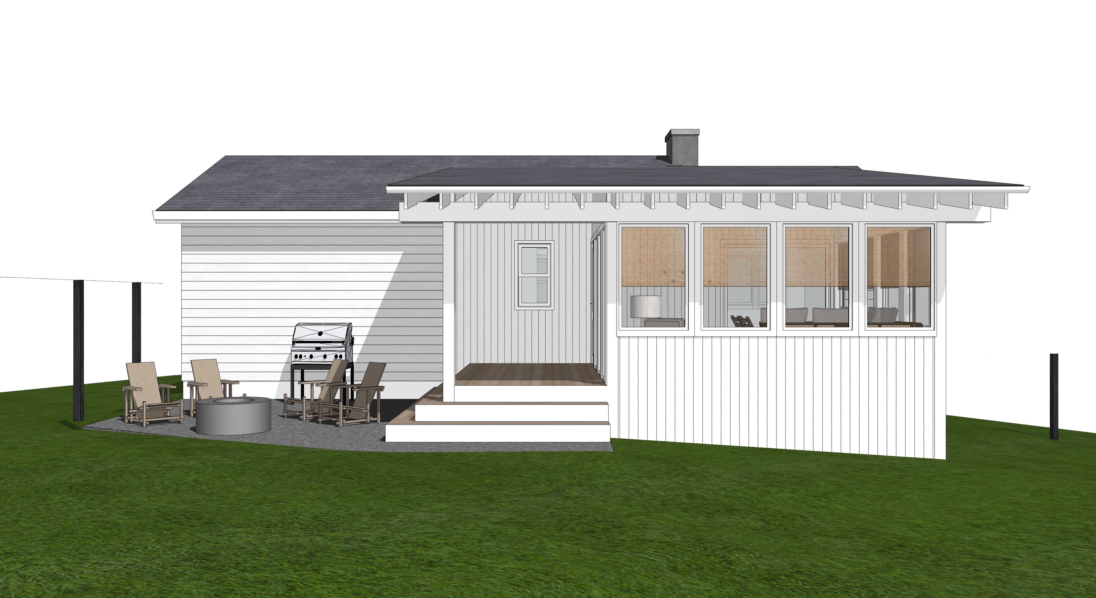 a simple white house and sunroom with a scandinavian design use the provided image as the exact base model and camera view do not change redesign or reinterpret any architecture roof forms window sizes siding layout porch proportions steps grill location or outdoor furniture placement maintain the exact perspective and composition render a photorealistic scandinavian countryside cottage in a calm natural setting architecture materials exterior siding painted soft matte nordic white combination of horizontal lap siding on the left volume and vertical board and batten on the right volume trim and fascia crisp white with subtle shadow lines exposed roof rafters under the extended eave dark charcoal asphalt shingle roof with realistic texture porch deck and steps in natural weathered pine or light oak windows with thin white frames and slightly reflective glass interior glimpses showing warm minimalist scandinavian furnishings outdoor patio area natural gravel patio with irregular stone edging four scandinavian wood lounge chairs with canvas seats around a round concrete fire pit stainless steel grill near the house minimal black posts for wire fence on the left landscape soft lawn with subtle variation in grass tone gentle rolling terrain woodland in the background rock outcrops in the left foreground natural informal landscaping not manicured lighting golden hour scandinavian summer light low sun creating long warm shadows soft sunlight grazing the siding to highlight wood texture warm interior lights glowing through the windows sky with light clouds and pale blue tones atmosphere calm quiet nordic countryside clean fresh air feeling slight lens bloom from the warm sun subtle depth of field