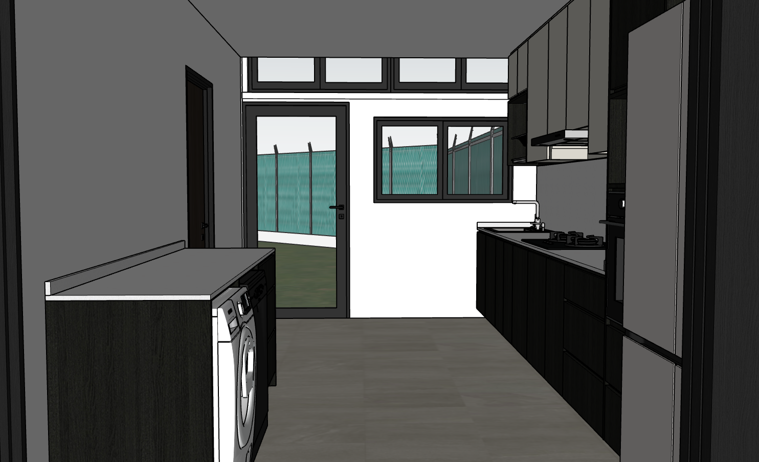 1 interior round spotlight center on ceiling led strip light underneath top hung cabinet remove reflection on furniture morning sunlight soft illumination smooth white colored walls matt white washing machine black walnut doors