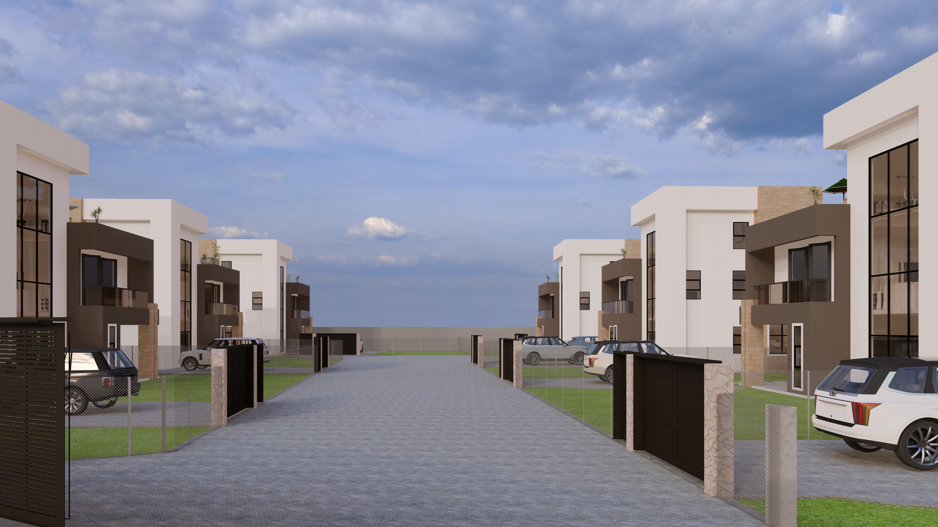 this is a housing estate add trees in background to give it context add street lighting one next to each gate all gets should be deep brown almost black have indoor warm lighting and 2 cars on the driveway