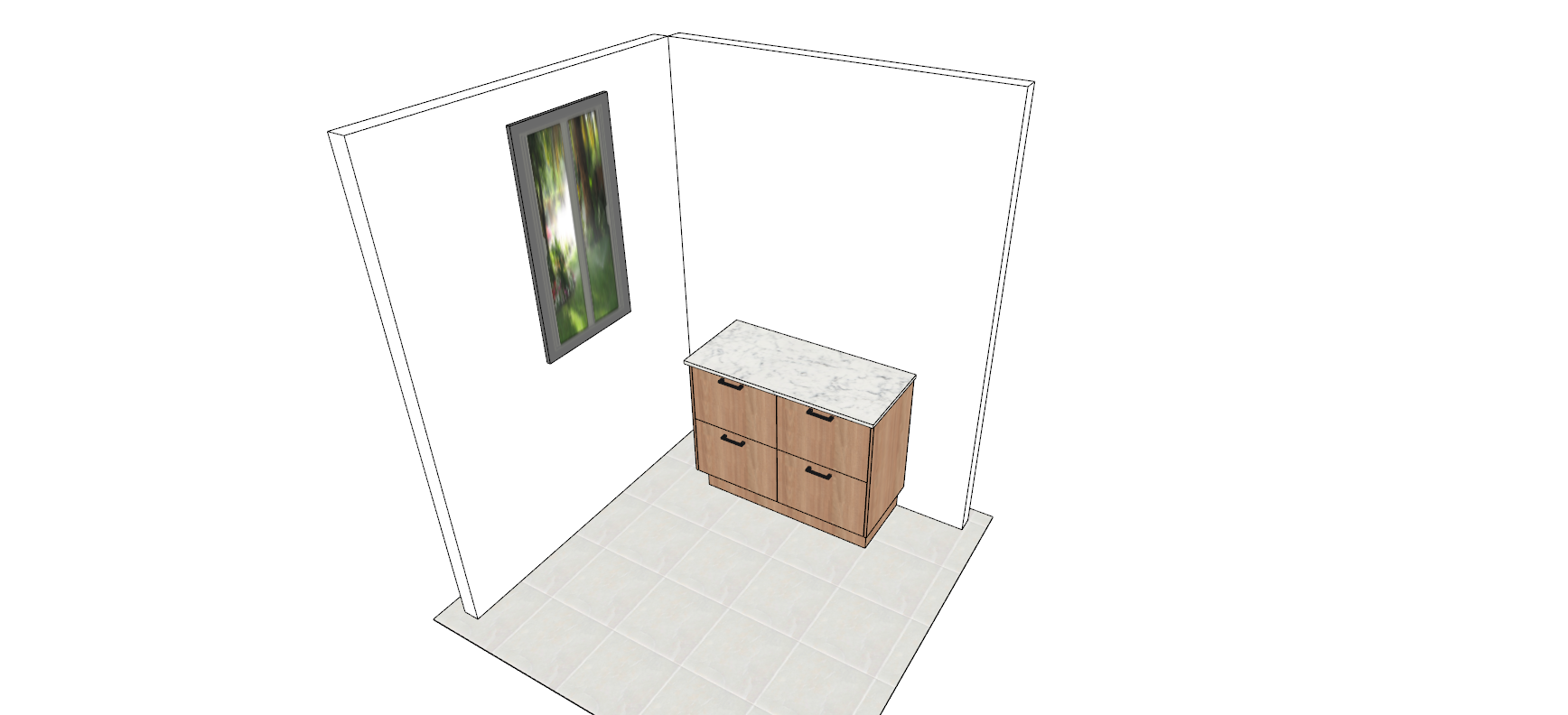 all cupboards to be flat panel woodgrain with gold handles put a basin in benchtop add natural sunlight arched mirror above the basin