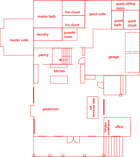 exterior shot create an elevation using this first floor plan 2nd floor should have 2 bedrooms and one bath and the great room would be an open 2 story architecture
