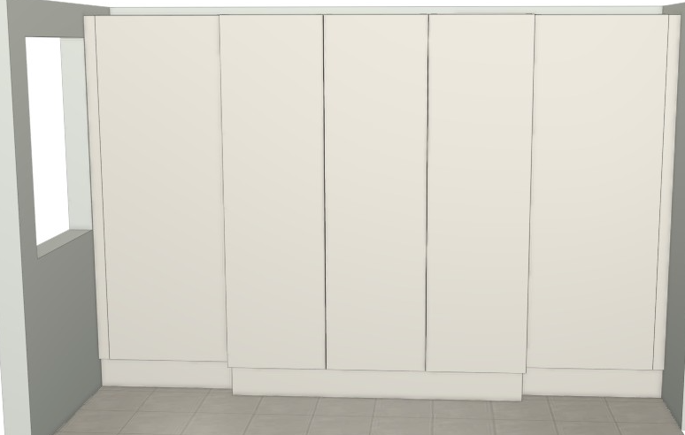 make the window on the left a french window add a skirting to the front of the wardrobes don t interfere with the doors the ceiling should be joined to the top of the units with a coving the floor should be oak herringbone put a ceiling at the top with no gap add a chinoiserie wall paper to the fronts something colourful the centre 3 wardrobe doors should have mirrors floor to ceiling but keep the outlines of all the wardrobe doors the wall to the left should have a different pattern on it something subtle