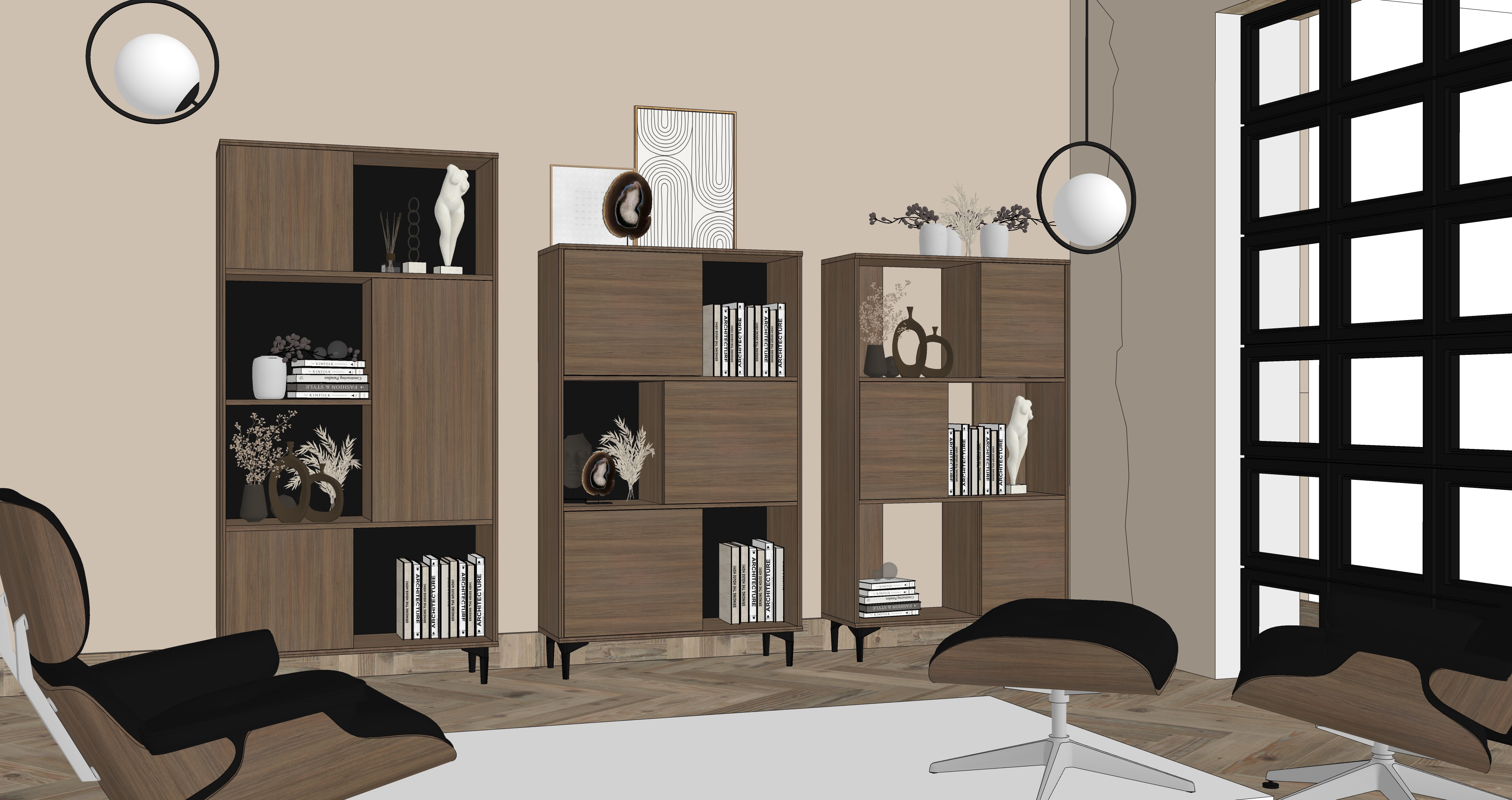 int rieur au design moderne et naturel salon haut de gamme avec un mur beige avec texture argile mobilier minimaliste en mat riaux art d co fauteuil eames en noyer et dessus cuir noir satin coussins beige lumi re naturelle douce entrant par de grandes baies vitr es en m tal noir du sol au plafond situ es droite cr ant des ombres subtiles et une illumination quilibr e lampe sur la droite pendant du plafond en verre fum clair finition satin pour les meubles ajoute des bouquets de plante s cher dans des pots de terre cuite blanc beige gris de forme art deco un tapis au sol en laine bouclette sur le sol en bois ch ne clair chevron textures ultra d taill es rendu photor aliste r solution 8k mat riaux ultra pr cis clairage physique r aliste palette de tons chauds ambiance contemporaine et sereine