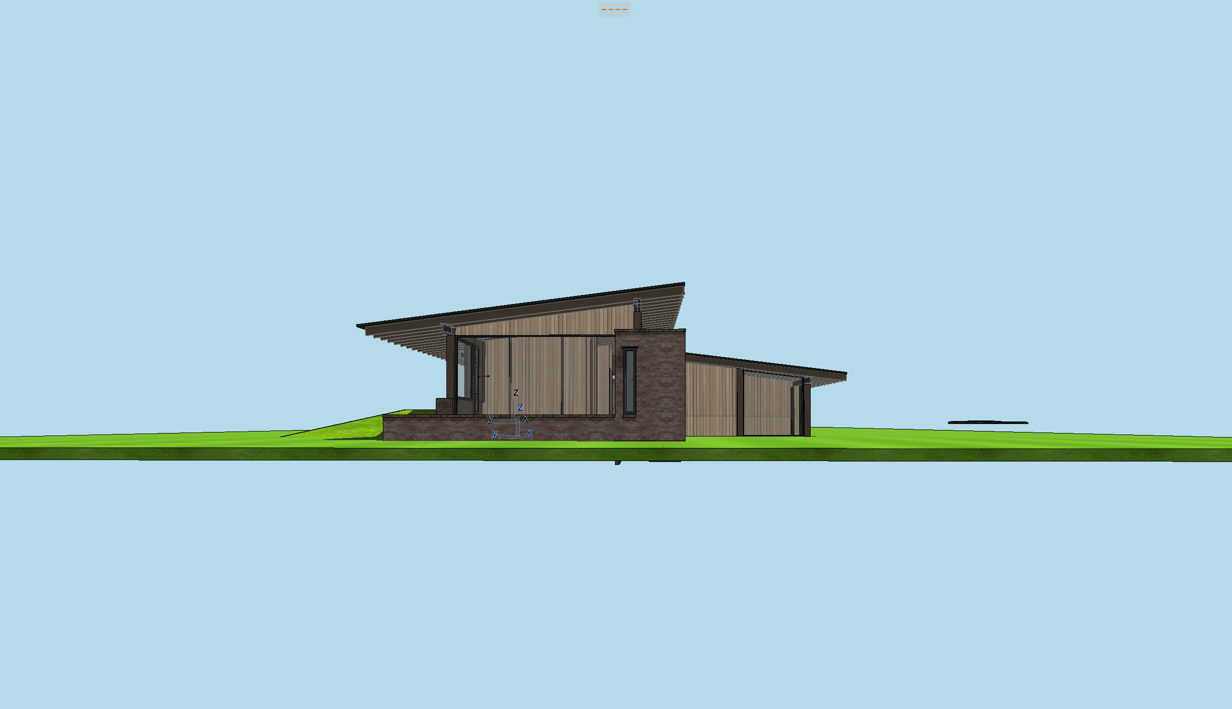 antique brick house with timber columns steel beams glass windows reclaimed pine soffit and a standing seam roof wild lousiana grasses and vibrant wildflowers all the way to house yellow pine trees in the background lake in the distance clouds in the sky all glass should be reflective so that in the interior of the house is not visible