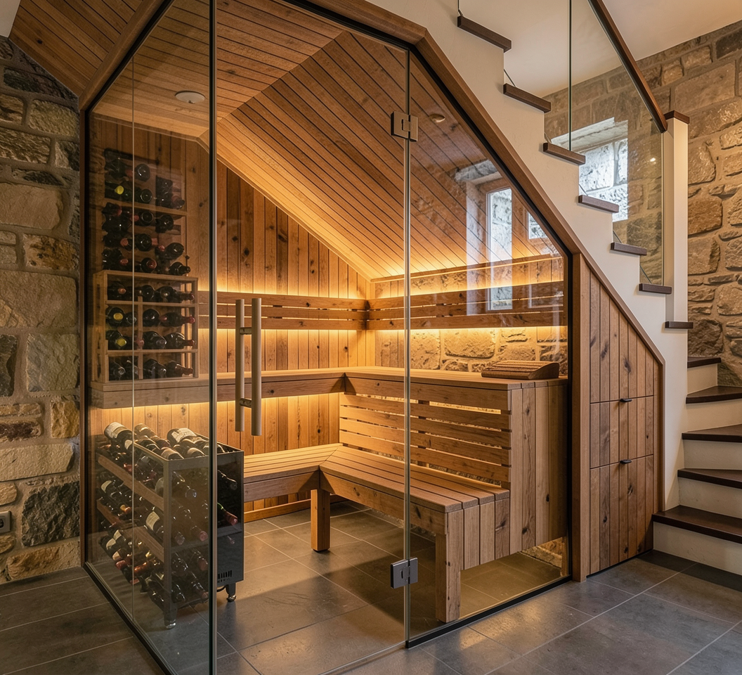 convert the sauna to a traditional wine cellar replace all parts of the sauna with wine racks remove the wood bench make a complete wine room