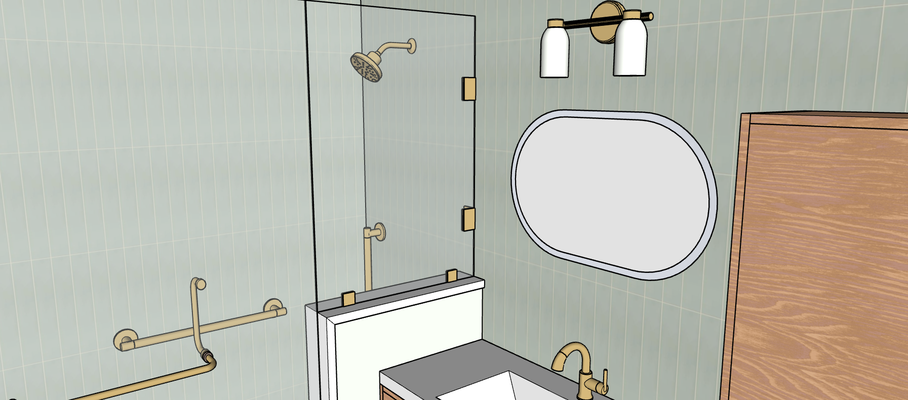 preserve all existing geometry materials and proportions lighting comes only from the vanity light with semi transparent scones 3500k mirror backlighting and ceiling fixtures the mirror has a soft white backlit halo 3500k evenly diffused there is no sunlight nor any light source other than the vanity light and backlit mirror linen cabinet has a red oak tone with the grain running vertically overall scene is evenly brightened using neutral 3500k ceiling lighting only do not add highlights glow reflections or new light sources