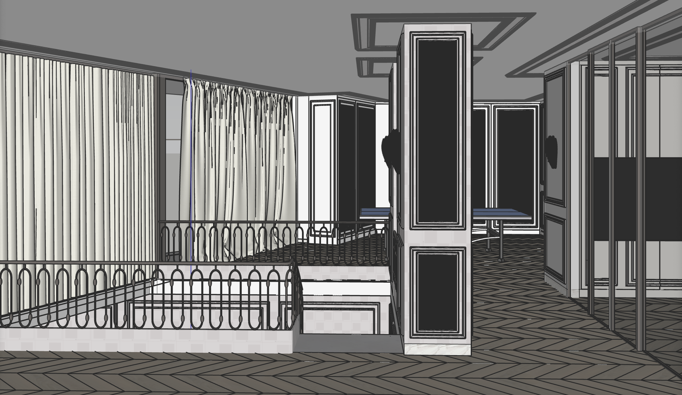 interior scene of an elegant modern room with a sophisticated atmosphere the walls are adorned with large panels of mirrors marked as black rectangles in model the floor is a parquet design featuring light beige tone the railings are intricate wrought iron with a deep black finish the ceiling is designed with white plasters complementing the overall monochromatic scheme the atmosphere is warm and inviting with ambient lighting enhancing the elegance of the space walls are beige grey on the back there are wardrobe with mirror on fronts and tennis table the hole room is very elegant and light on the ceiling there is subtle recessed spot lighting the overhead lighting is warm and atmospheric creating a cozy yet sophisticated ambiance the herringbone patterned floor enhances the sense of spaciousness minimal greenery and interesting accessories add freshness to the interior while maintaining its minimalist and clean character daylight enters from the left through delicate cashmere curtains in a gray beige shade neoclassic style little modern twist