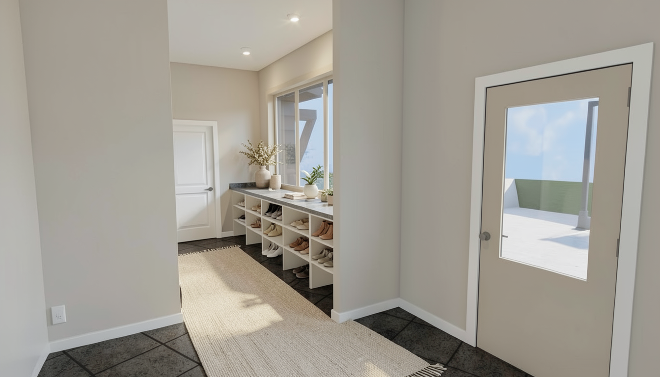 add minimalist decor on the countertop shoes on the shoeshelf add a small entry doormat inside each door