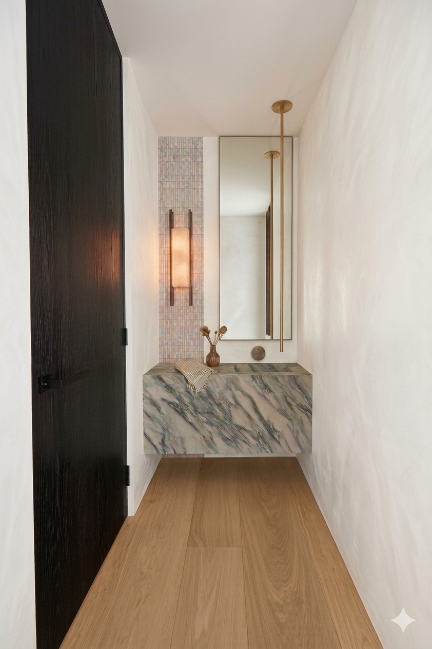 a high end architectural digest style interior photograph of a luxury powder room with a quiet luxury aesthetic shot on a 24 28mm full frame lens at eye level with subtle asymmetrical composition realistic architectural framing and natural spatial depth the scene is lit using a physically accurate 4 layer architectural lighting system designed for high end editorial interior photography 1 key light primary illumination the primary light source is soft diffused natural daylight from an unseen large window or skylight off frame this daylight is bright neutral warm approximately 4000k and evenly fills the space without flattening it it establishes overall visibility and ensures all materials are readable while preserving depth the daylight is softened through architectural diffusion creating gentle shadow transitions and natural falloff not harsh directional shadows 2 fill light global bounce control secondary illumination comes from natural bounce light off the portola roman clay walls and white oak flooring this creates a soft warm ambient lift in shadow areas without flattening contrast a subtle invisible ceiling bounce ambient layer very low intensity ensures no crushed blacks while preserving dimensional separation between surfaces this fill light is not direct or visible it exists only as reflected illumination 3 accent light sculptural emphasis a warm 2700k wall sconce on the left bianco antico tile wall acts as a controlled accent light it produces a soft directional glow that grazes the textured tile surface enhancing depth and material relief the sconce does not overpower daylight it creates localized warmth shadow variation and visual hierarchy on the left side of the composition 4 architectural base light subtle integration a hidden under vanity led wash 2700 3000k extremely soft intensity creates a floating effect beneath the green oasis marble vanity this light gently illuminates the floor plane and adds spatial separation between vanity and flooring it is low intensity and fully diffused visible only as a soft glow not a light source material space response to light the green oasis marble vanity responds with soft controlled specular highlights and full veining visibility light grazes the stone naturally from multiple directions preventing flatness or overexposure the borderless vertical mirror reflects a balanced mix of daylight and soft shadow gradients it remains realistic with no blown highlights or overly dark reflections the arto bianco antico vertical tile wall shows strong texture definition under grazing sconce light with daylight maintaining overall readability the aged bronze ceiling mounted faucet and wall control knob catch subtle edge highlights from multiple light sources without disappearing into shadow the portola roman clay walls brooks softly diffuse daylight and bounce warm ambient light across the room preventing harsh transitions the wide plank white oak flooring remains evenly visible with soft natural shadowing and minimal reflection acting as a grounding surface the interior door is finished in matching white oak veneer aligned with the flooring species and tone for full material continuity matte finish subtle grain and minimal brushed bronze hardware integrate it into the architecture lighting result critical behavior rules lighting must read as bright architectural digest editorial daytime interior multi source layered illumination not single light moody soft but present contrast no flatness no darkness visible depth in corners without crushed blacks natural shadow hierarchy key bounce accent fill interaction do not produce flat evenly lit showroom lighting over dark cinematic shadows single source lighting look overexposed hdr washout cgi perfect uniform brightness render quality ultra realistic v ray corona renderer quality physically based rendering with global illumination ray traced reflections and realistic light decay high end architectural digest editorial photography aesthetic 8k resolution subtle imperfections in plaster marble veining variation and reflection behavior for realism a ceiling mounted modern column faucet in aged bronze descends vertically from the ceiling positioned precisely over the sink basin the faucet is completely independent and not connected to the wall in any way on the wall there is only a single small minimal control knob in aged bronze this is a standalone on off control not part of a wall mounted faucet system it is circular knurled and low profile with no backplate no spout and no additional hardware a slender aged bronze water column descends from the ceiling positioned directly over the sink it is minimal and sculptural with no visible connection to the wall on the wall there is only a single small circular bronze detail minimal and flush it reads as a simple control point not a fixture assembly it is not connected to any spout or plumbing system the wall surface remains clean and uninterrupted there are no wall mounted faucets no spouts no handles no backplates and no multi part fixtures the composition should not emphasize this element it remains subtle minimal and secondary to the overall design no wall mounted faucet no wall spout no widespread faucet no multi part plumbing fixtures do not combine elements do not generate additional handles or plates only one small circular wall detail is allowed reverse door opening