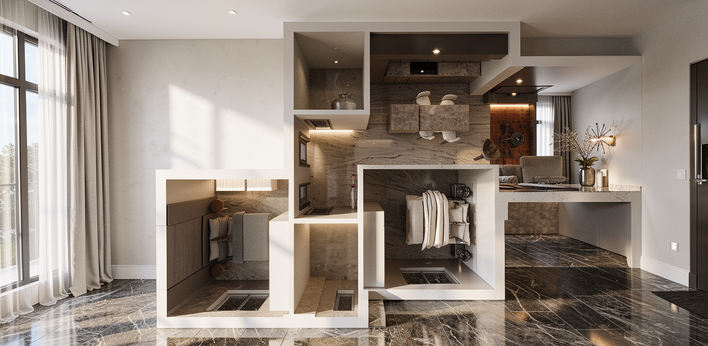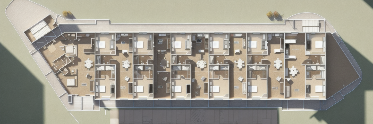 modern aerial shot show me an realistic floor plan with high detail furniture architecture