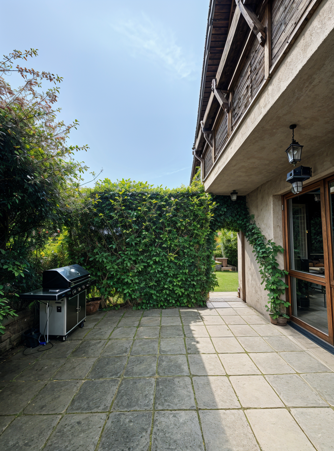 make it more realistin delete the lights from the building add the pot big rectangule one in front of the green wall floor bigger rectangular without grass beetween make it mor minimalistic ang clean delete the grill