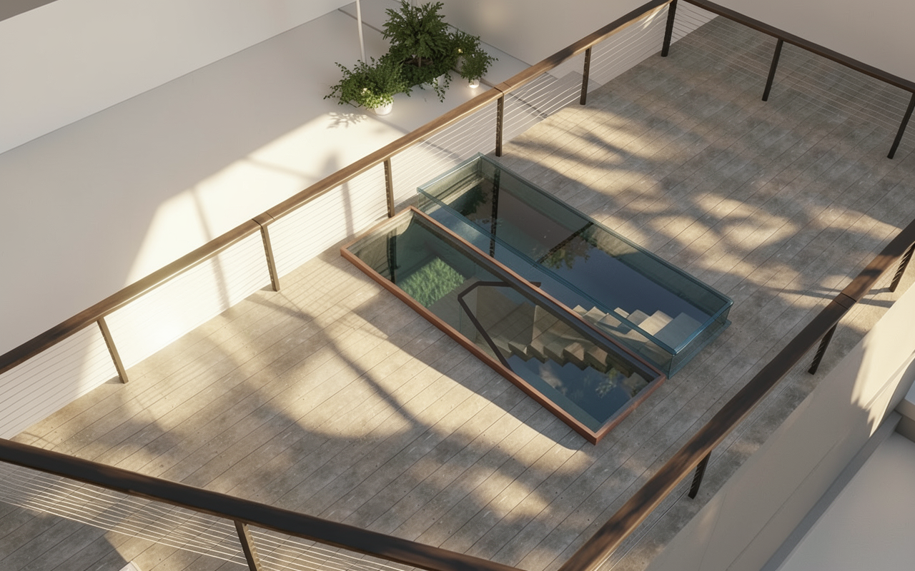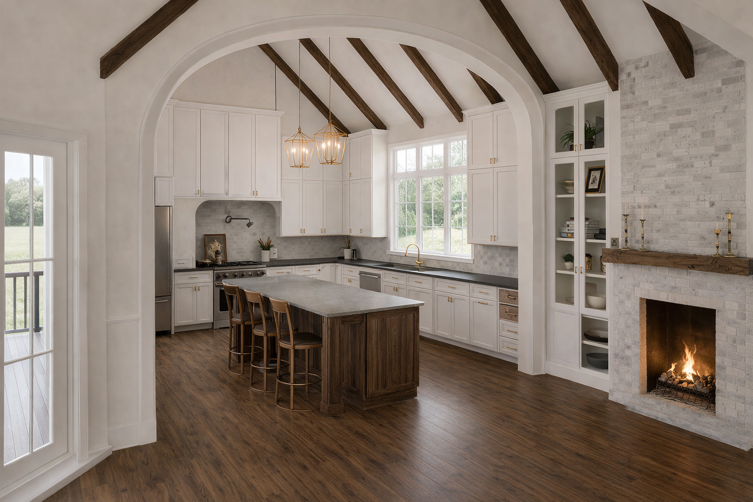 create a tropical scene siding will be a gray green color all trim will be white metal roof to be natural silver concrete floor in the patio