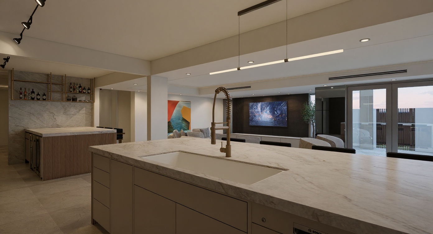 house is in a neighborhood concrete driveway on the left with a concrete sidewalk to the front porch garage door has glass on the top row minimal landscaping and a tree in the foreground shake siding in top gable