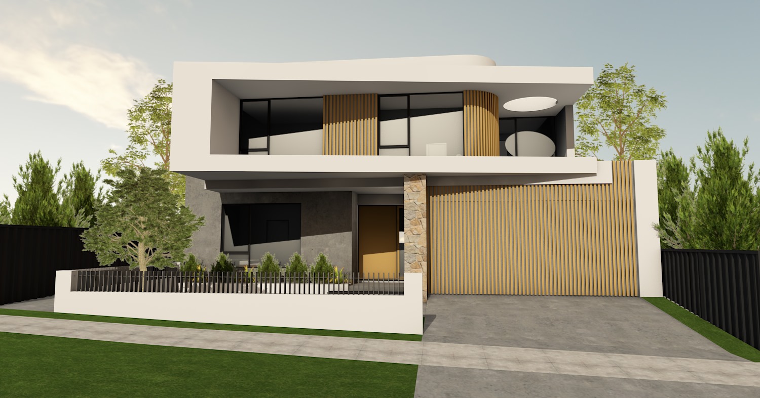 sunny afternoon concrete plaster finish to ground floor wall to the left light brown stone cladding to feature wall