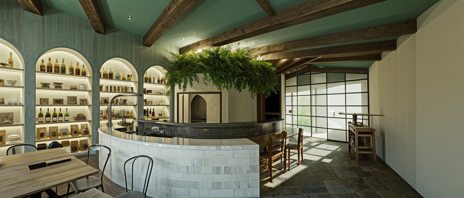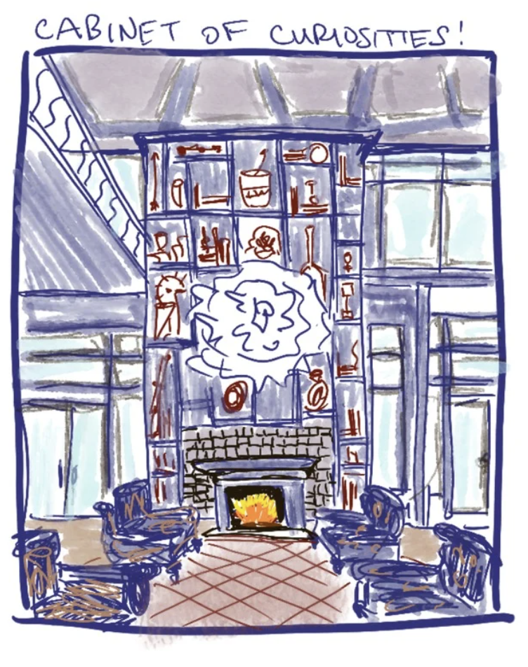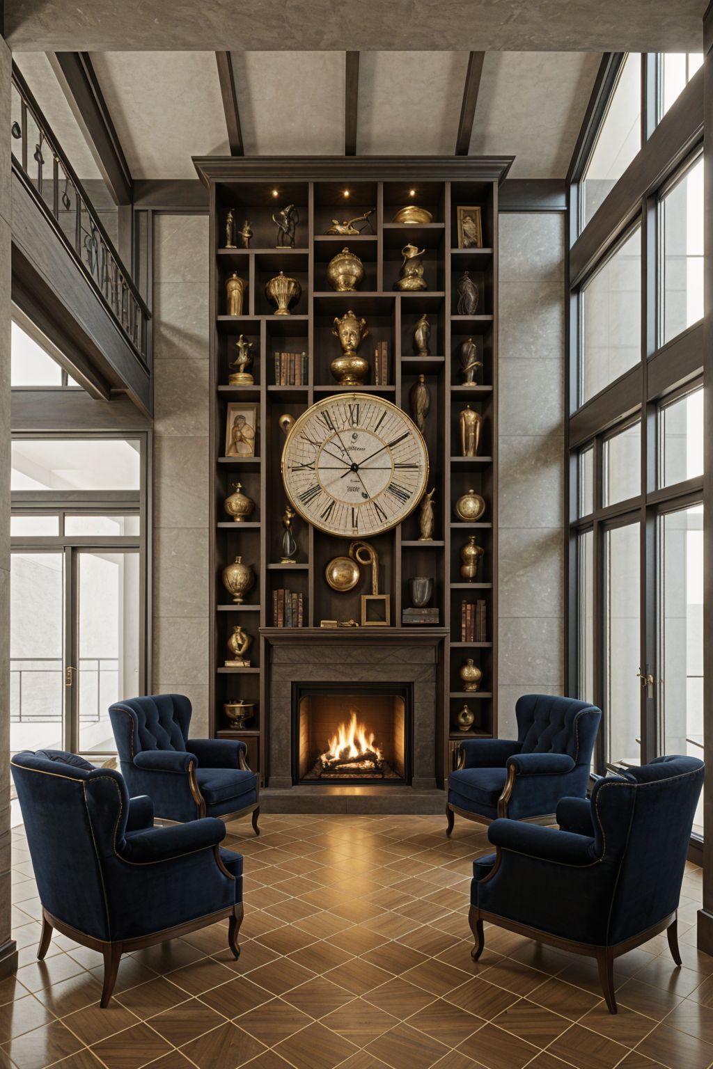 interior shot this large two story fireplace feature with a cabinet of curiousities shelf system is painted blue the architectural style is federal but modern a large piece of modern art is juxtaposed atop the large built in shelf unit above the cozy marble fireplace