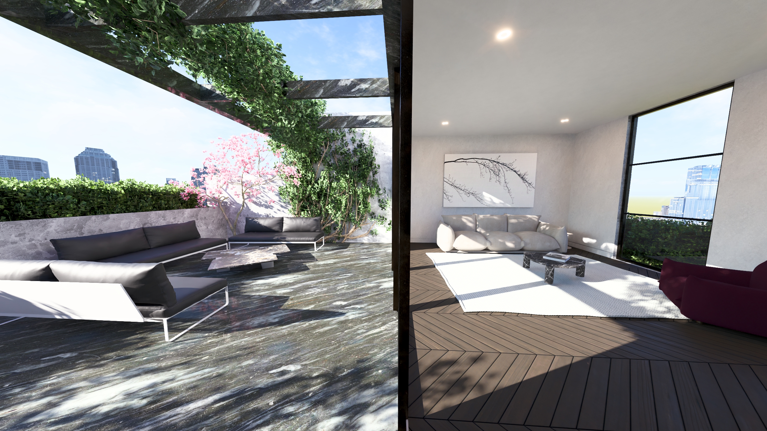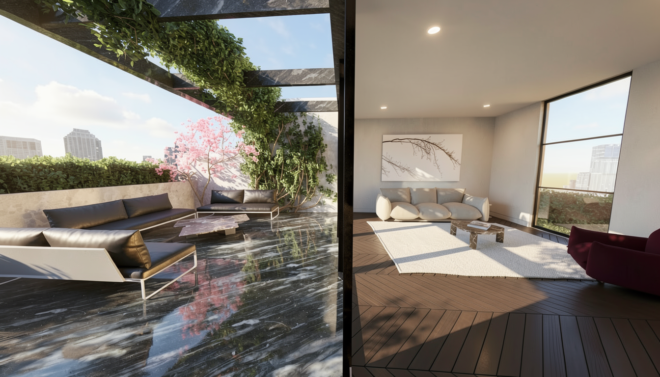 improve outdoor terrace landscaping for contemporary look make the render ultra realistic