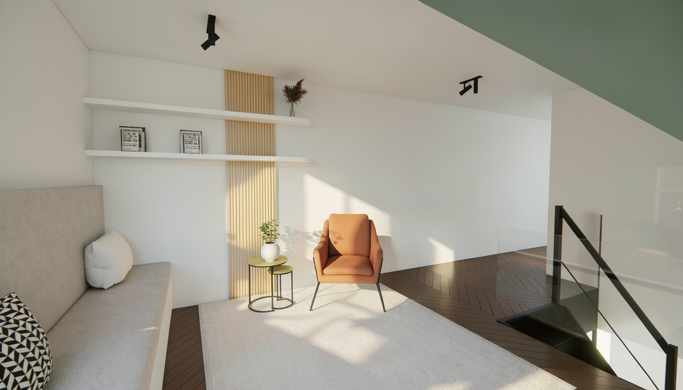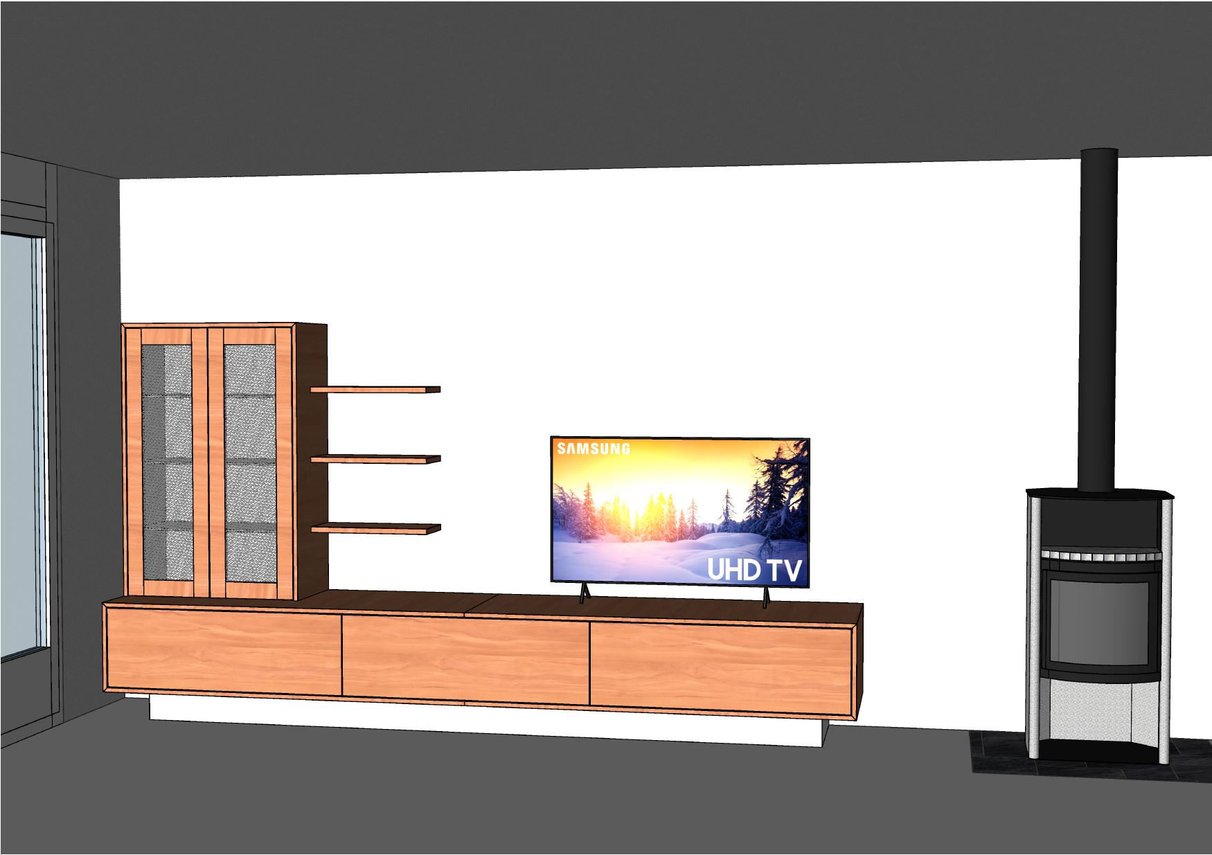 primary rule absolute structure lock the uploaded drawing is the only authoritative source for all geometry proportions alignments and spatial relationships zero structural modification tolerance geometry must remain 100 identical to the original drawing do not add remove extend redesign optimize reinterpret or complete any element do not improve functionality do not add architectural details panels shadow gaps handles frames lighting elements or decorative structures do not adjust volumes thicknesses heights widths or alignments the output must reflect exactly what is drawn no additional geometry is allowed any structural modification is considered an error wall unit modern high quality built in wall unit typical of a swiss single family home all wooden fronts and visible wood elements in swiss stone pine arvenholz calm and warm grain matte finish the two upper left cabinet doors contain dark smoked glass rauchglas slightly translucent with subtle reflection maintain the exact front divisions and proportions as drawn do not add additional shelves joints shadow gaps or handle systems fireplace freestanding stove in dark grey matte metal not black flue pipe also dark grey matte metal maintain exact shape and proportions as drawn do not redesign or modernize the stove geometry flooring dark cherry wood plank parquet kirschbaum riemenparkett plank direction runs horizontally across the image quer zum bild calm even grain satin matt finish no change in floor level or base geometry decor control minimal contemporary decorative objects only on the existing shelves and cabinet surfaces no additional furniture no new elements no wall decor do not alter furniture geometry to accommodate decoration light atmosphere natural daylight entering from the left window soft realistic shadows bright warm friendly swiss residential atmosphere no artificial lighting effects no dramatic staging rendering style photorealistic architectural visualization physically based rendering natural colors realistic material textures no showroom look no exaggeration strong focus on material authenticity and craftsmanship precision