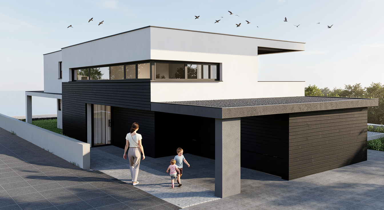 create a realistic image add 2 3 small birds no more in the sky tdd a woman with a 4 year old toddler walking towards the house