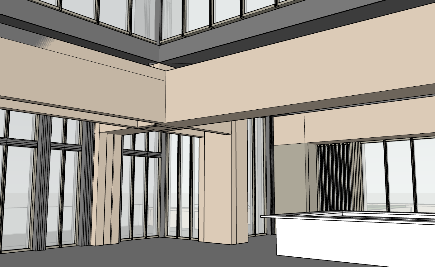 render a modern interior architectural space with high ceilings and large windows use soft beige for the walls and a warm light gray for the floor the window frames should be a sleek dark gray illuminate the scene with natural daylight streaming through the windows creating a bright and inviting atmosphere add subtle reflections to the glass and a hint of greenery outside enhancing the serene and open feeling of the space add a translucent canopy hanging from the ceiling like the one in the reference image