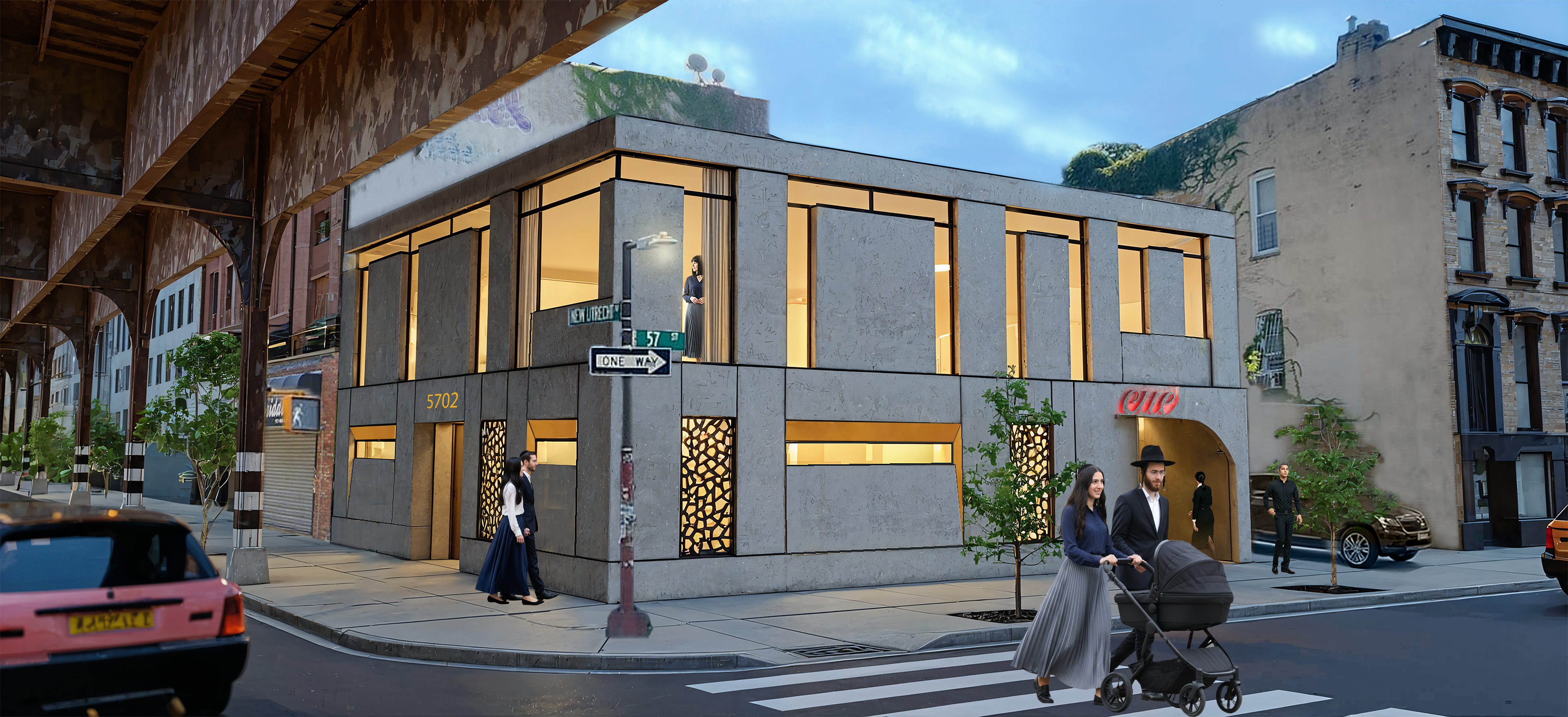 contemporary two story fa ade with smooth concrete panels in a pronounced grain texture bronze metal accents and elegant bronze lattice details large glass windows reveal a warm well lit interior urban brooklyn street under an elevated train line cinematic dusk not too dark 4 pm atmosphere ultra photorealistic architectural render