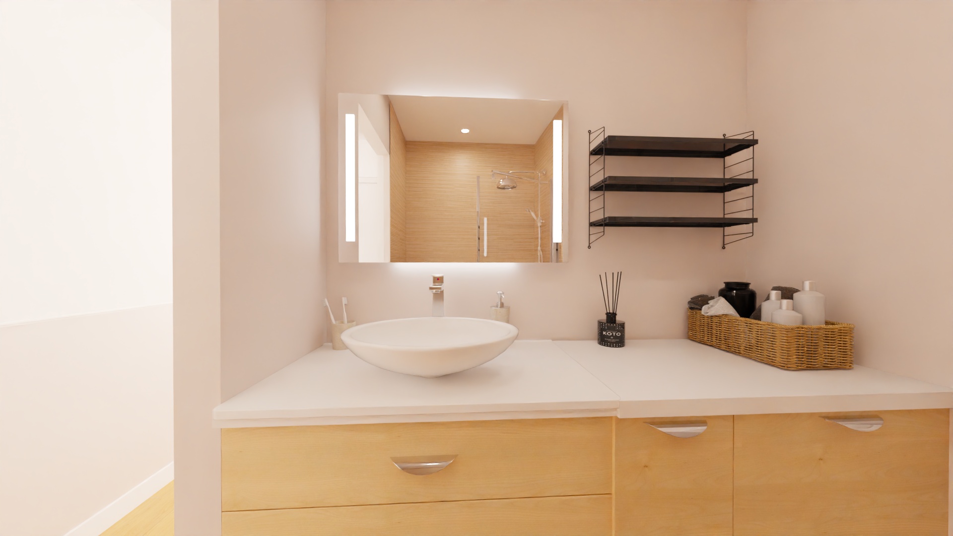 transforme ce rendu en dessin au feutre maintient le rose pale au mur