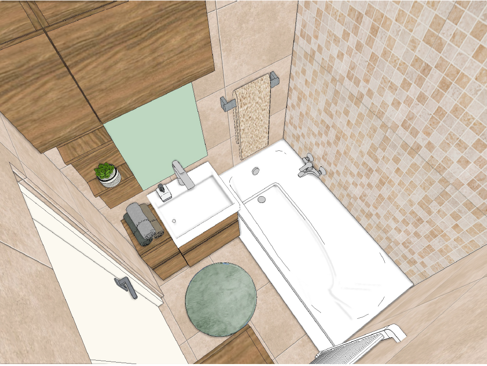 interior from the top render a cozy modern bathroom from a top down perspective use warm beige tiles for the walls and floor incorporating a textured mosaic pattern the bathtub should be a crisp white with sleek silver fixtures include a wooden vanity with a glossy finish and a white rectangular sink add a light mint green wall panel behind the vanity for a splash of color place a small potted succulent with vibrant green leaves on the vanity arrange two neatly rolled gray towels beside it hang a beige waffle textured towel on a silver towel rack next to the bathtub add a round soft mint green bath mat on the floor create a serene and inviting atmosphere with natural warm lighting