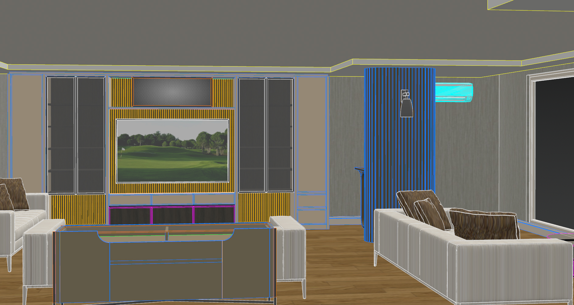 there should be a sea view from the window led lighting on the ceiling the covers should remain the same and the gray metal frames should have reflective glass