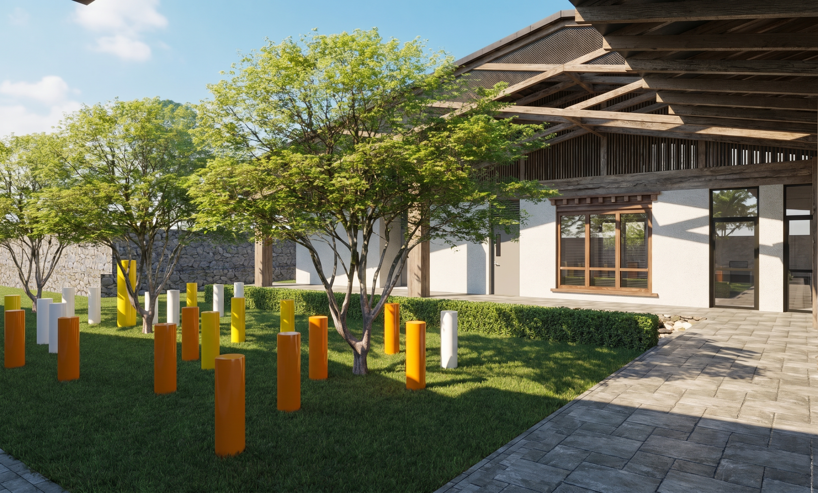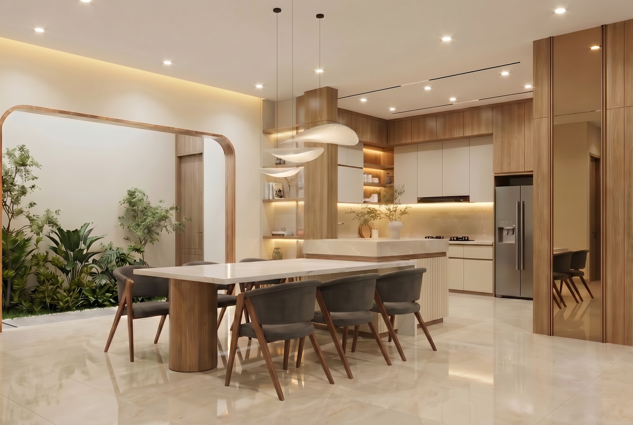 ultra realistic modern minimalist villa exterior front view strict architectural accuracy based on input model preserve exact geometry proportions and layout no modifications clean fa ade with white stucco walls light grey concrete elements and natural wood garage door strong horizontal lines and flat roof volumes smooth parapet walls with no visible joint lines or separations garage door open with interior visible two realistic parked cars inside partially shaded natural placement environment open natural landscape with soft greenery scattered trees and minimal surroundings simple asphalt road directly in front of the house only clean transition between road and ground no buildings materials highly realistic and detailed materials matte white stucco with subtle grain and slight tonal variation exposed fair face concrete with visible formwork texture natural imperfections small pores and panel joints light grey concrete with variation natural wood with visible grain and slight weathering black metal gate with realistic finish surface detail subtle imperfections such as slight dirt accumulation near ground micro edge wear realistic material transitions and joints lighting natural daylight with balanced exposure physically accurate shadows clear sky illumination no overexposure no haze or glow reflections realistic glass reflections showing sky and environment subtle and controlled foreground asphalt road with realistic texture and imperfections soft natural shadow interaction camera eye level architectural perspective slightly angled 24mm lens rendering constraints full image sharp and in focus no blur no depth of field no bloom no haze render style ultra photorealistic high end architectural visualization physically accurate materials and lighting ray tracing global illumination mood realistic grounded high end residential architecture strictly preserve architectural geometry and material distribution from input model