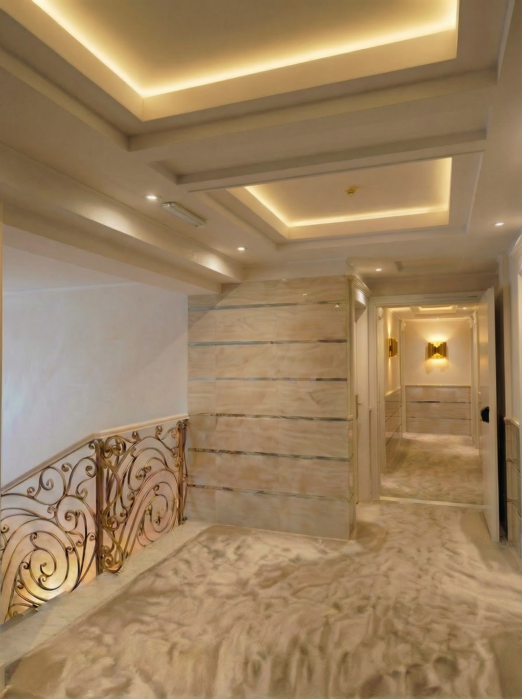 inserisci due rettangoli in vetro bianco sulla parete in fondo al corridoio rendi la foto meno satura