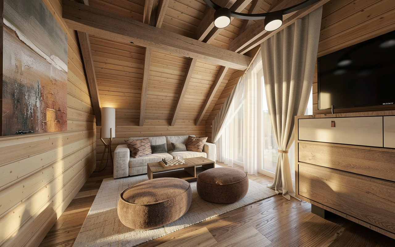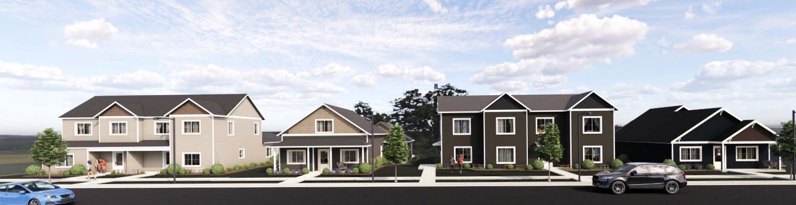 make this neighborhood rendering more realistic and include realistic trees make the house colors coordinate with the existing colors