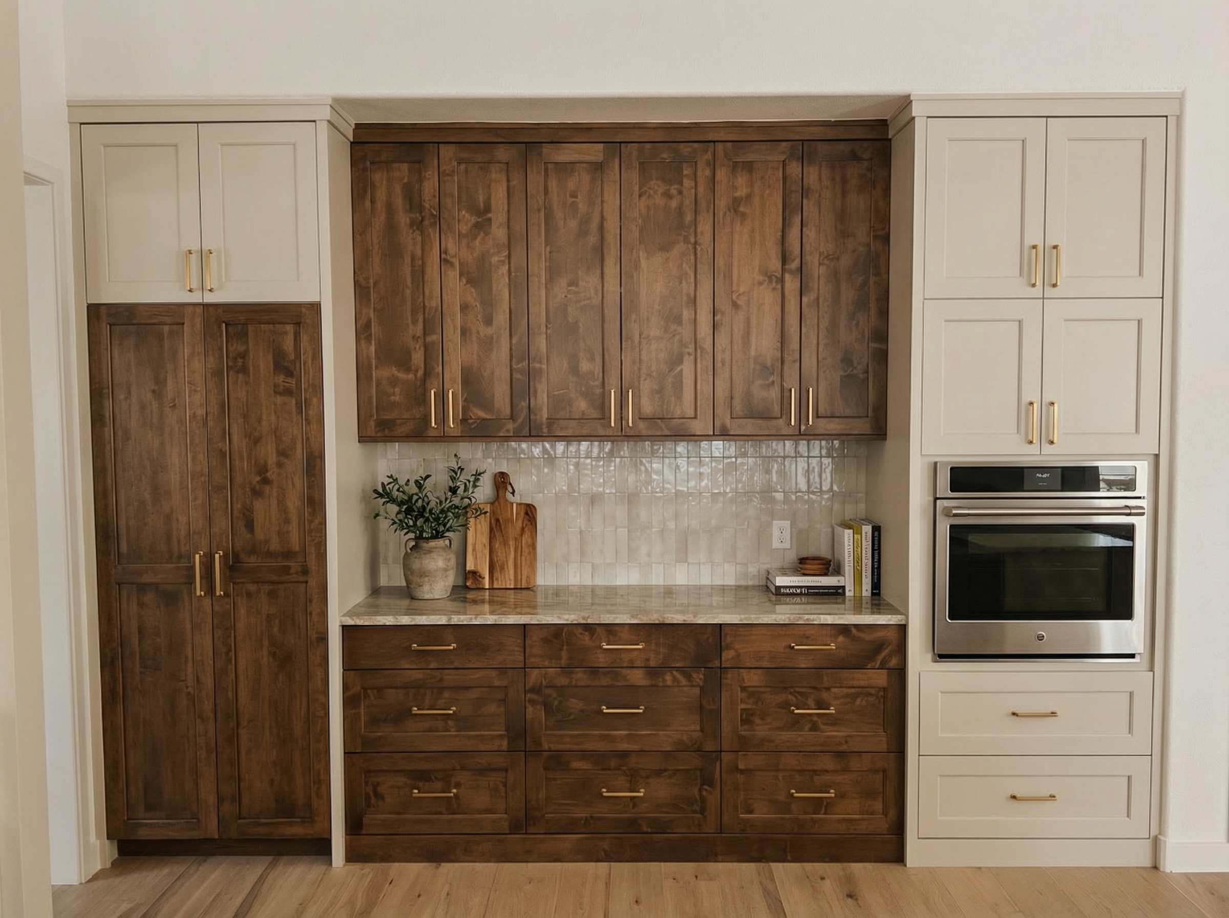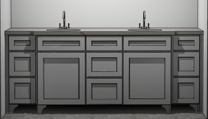 exterior shot cabinets are to be a light creamy white do not change anything with the cabinets but make it look like a real life picture add mirrors and lighting etc