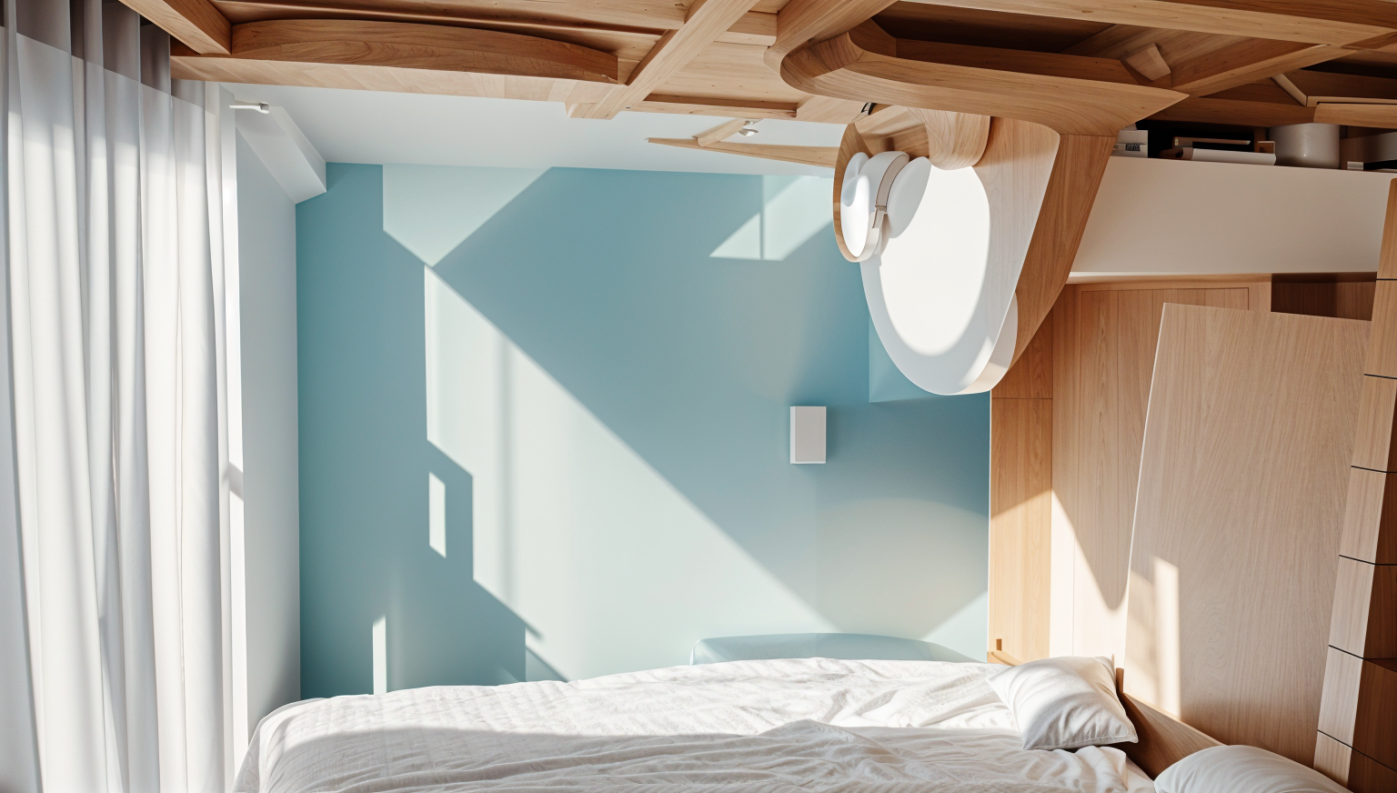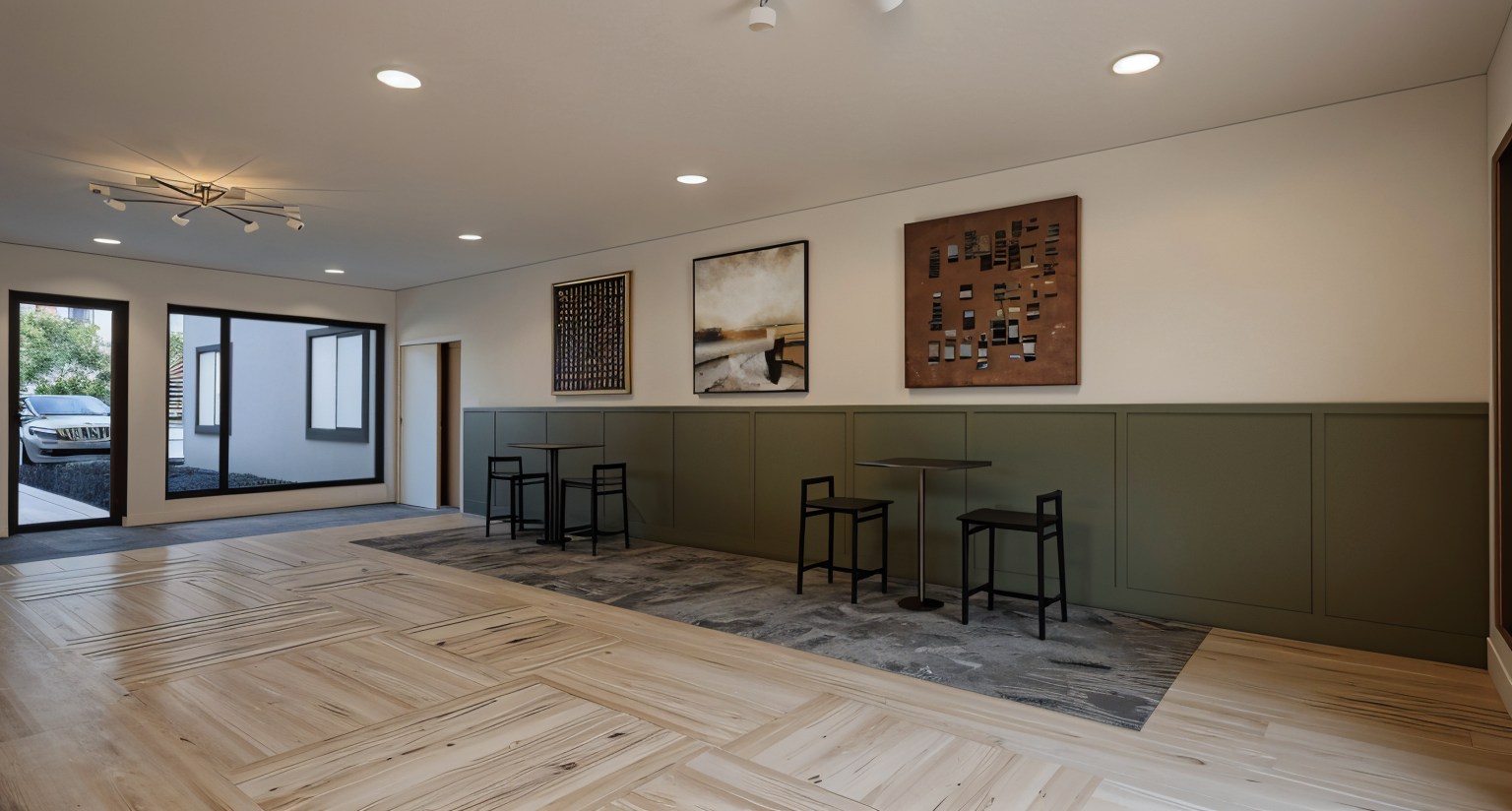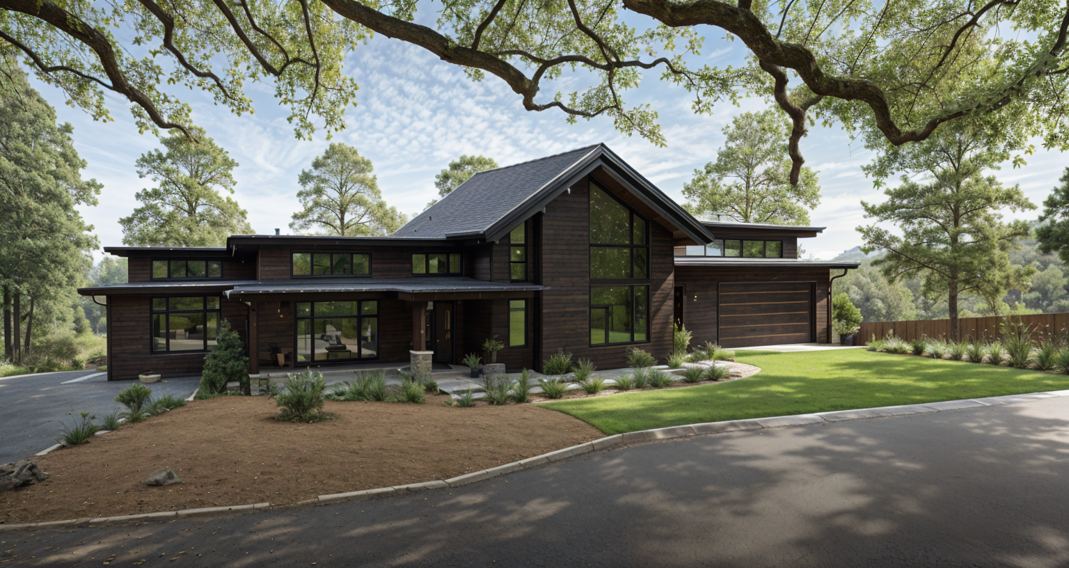 a modern suburban house with a clean minimalist design featuring crisp white walls and shingle wood roof the large windows have black frames complementing the light inviting facade add a wooden garage door in a warm light oak color and incorporate lush green shrubs and a well manicured lawn for a fresh and vibrant atmosphere center gable with two triangular openings the sky is a soft blue creating a serene and peaceful setting