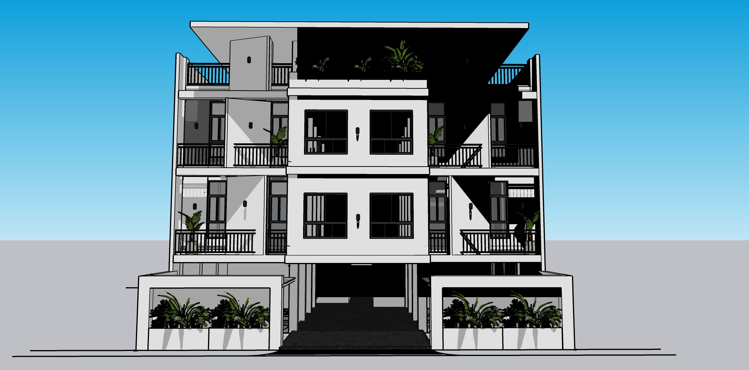 building is smooth white color symmetrical building facade add road in front with 1 passing car add 3 people walking in front add tropical country trees in the background