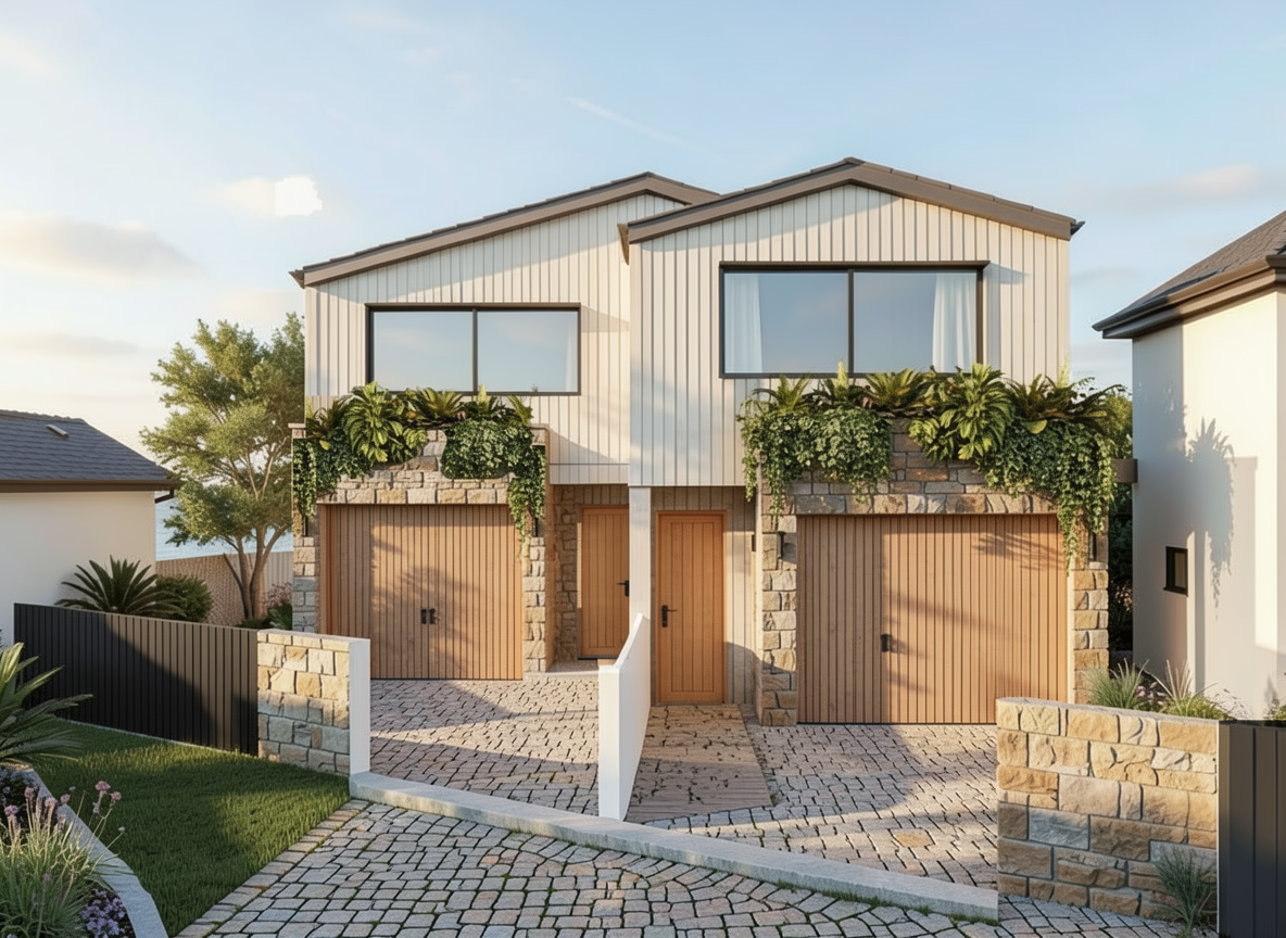 change the driveway to limestone cobblestones make the garage doors vertical timber battens make the driveway cobblestones smaller and more regular add a landscaped garden bed on each side of the middle fence about 1m wide