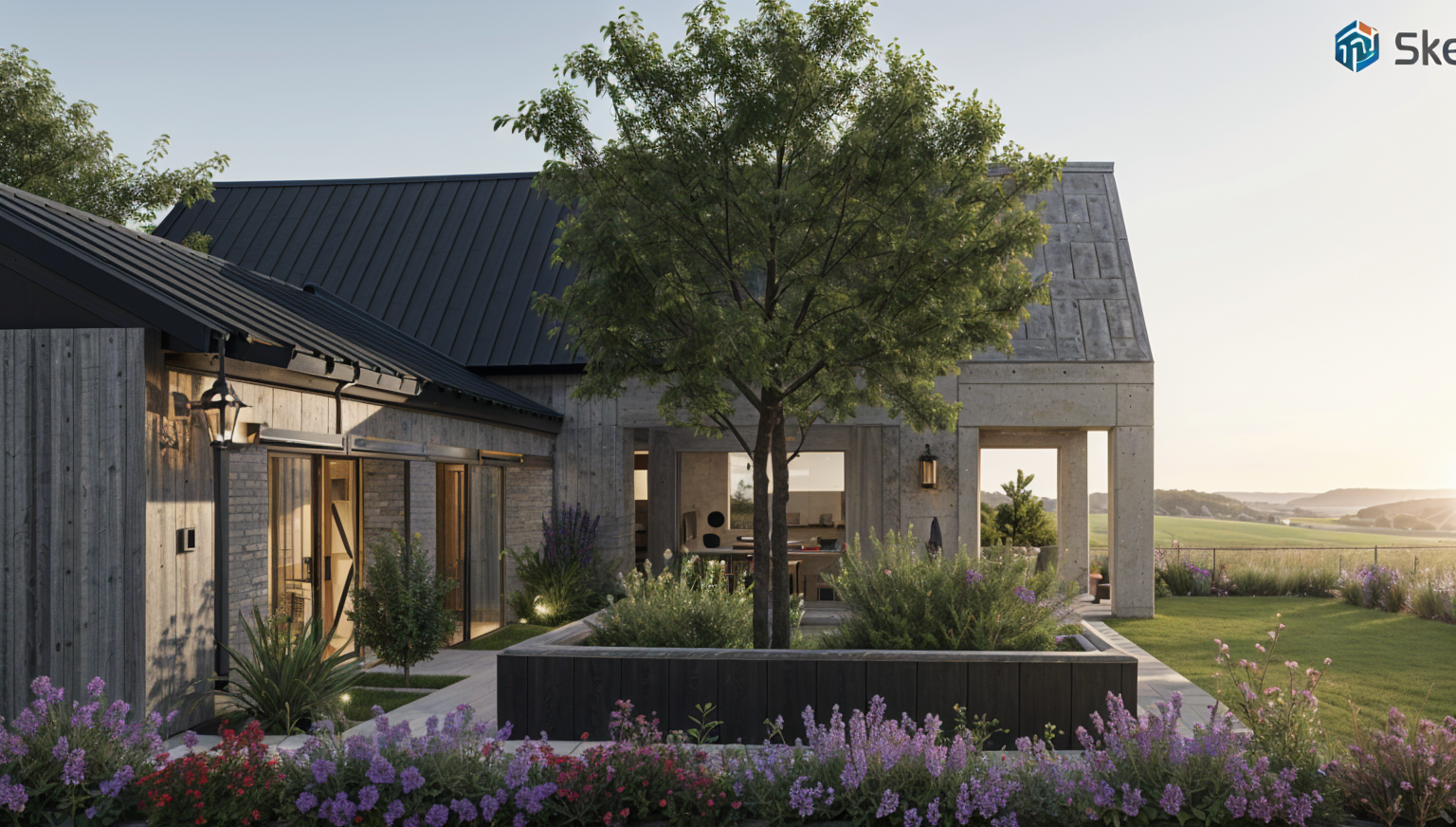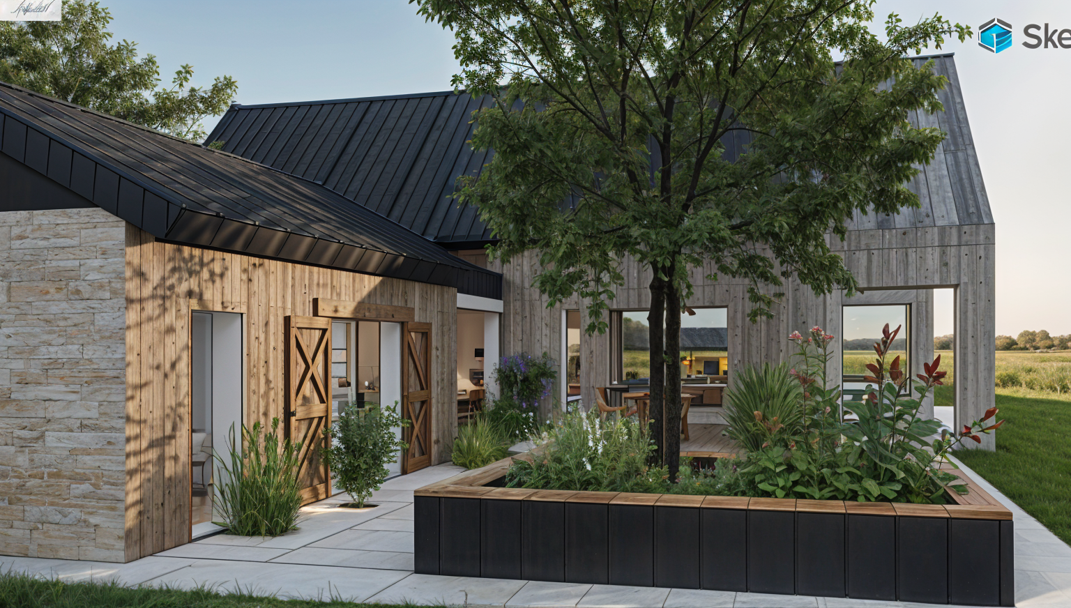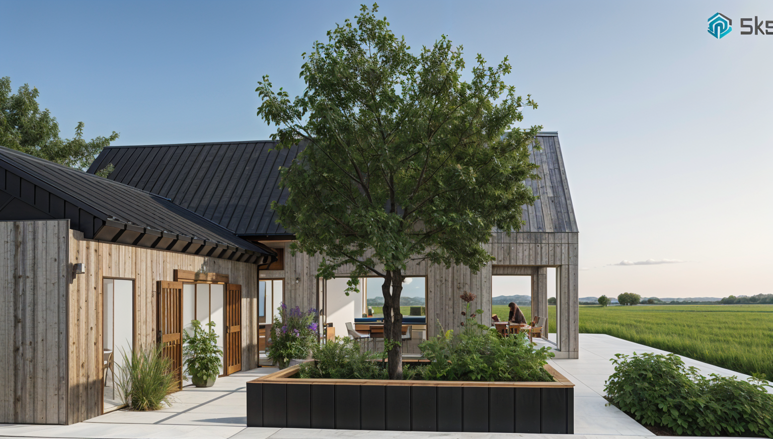 large mature trees around cabins lake in front black standing seam metal roof glass front