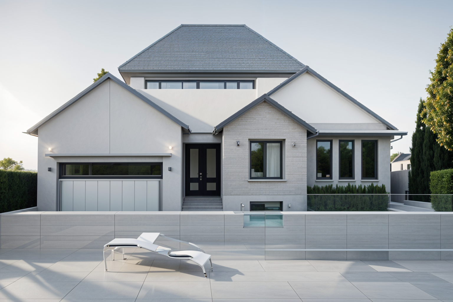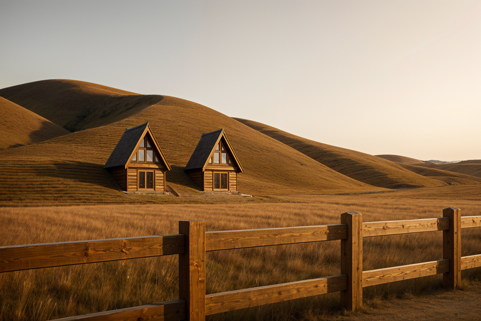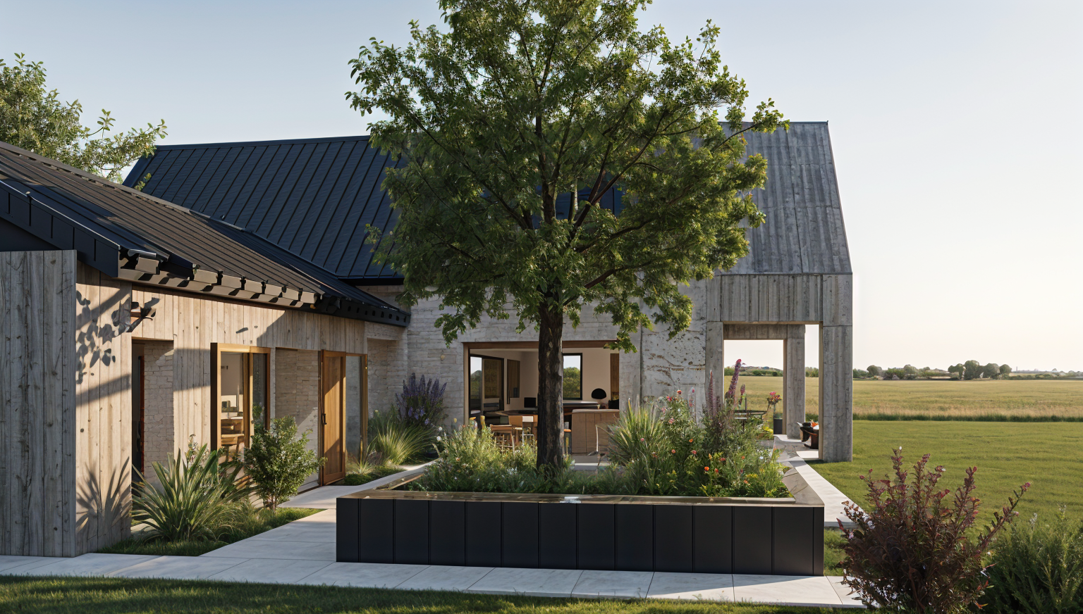 large mature trees around cabins lake in front black standing seam metal roof glass front
