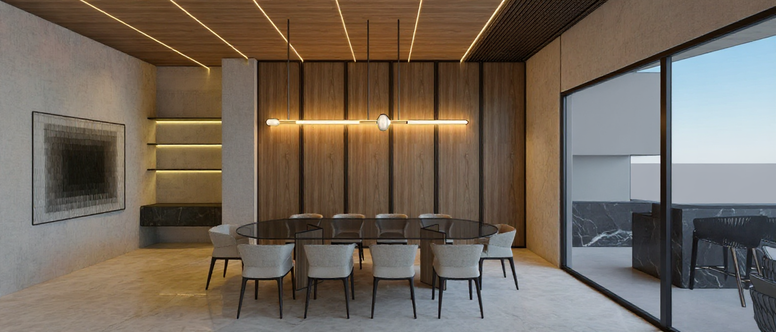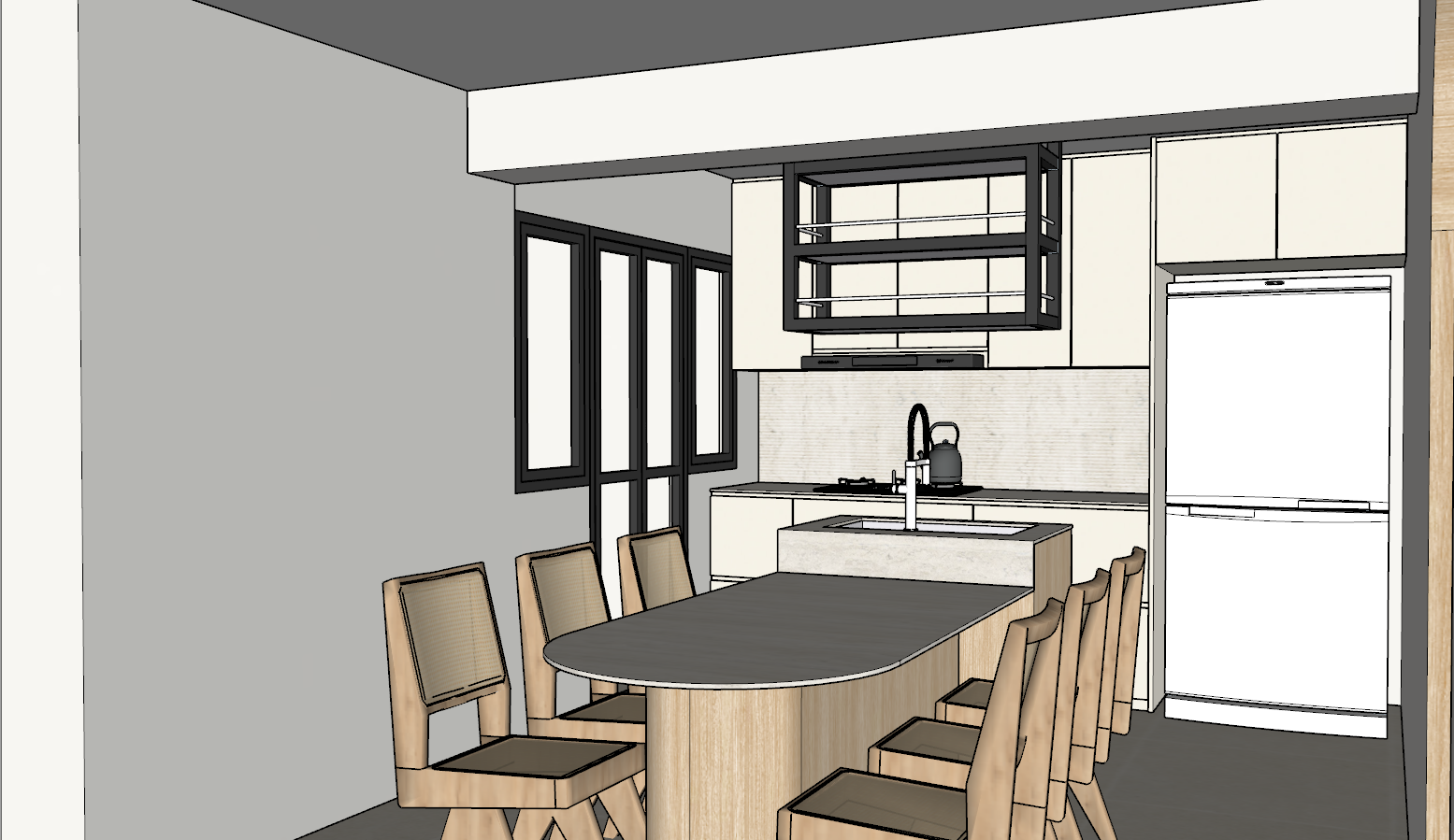 render a cream colour kitchen with grey floor tiles and add some war lighting architecture