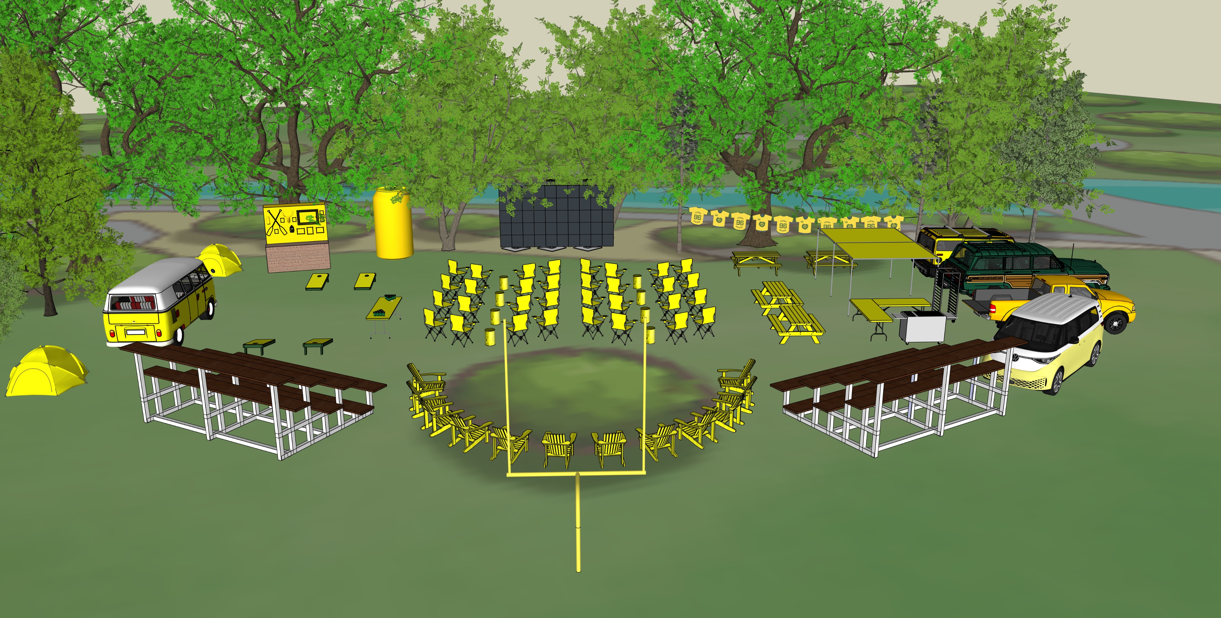 setup up this tailgate event in the woods set at oak canyon ranch in california set in deep oak trees make the surrounding area lush with lost of foliage