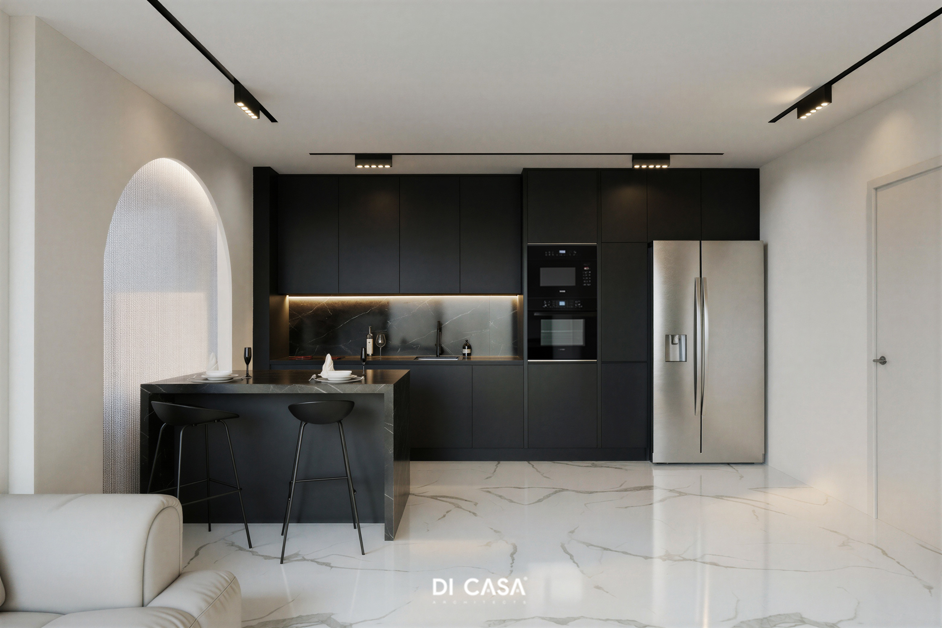 keep the exact kitchen design layout proportions lighting camera angle furniture placement appliances and overall composition unchanged change only the black marble stone surfaces on the kitchen backsplash countertop and island cladding to white marble identical to the floor marble with the same white base tone and the same soft grey veining pattern as the existing floor make the stone look seamless realistic and high end as if the kitchen stone and floor are from the same marble slab family maintain proper scale of veining across all surfaces keep the cabinetry matte black keep the fridge stainless steel and do not change any other materials or colors preserve the minimalist luxury style and render it as a highly realistic interior visualization negative prompt do not change layout do not change cabinetry color do not change island shape do not change appliances do not change lighting do not change floor do not add objects do not redesign scene do not alter camera angle no different marble color no dark stone no extra decor no material changes except specified stone surfaces