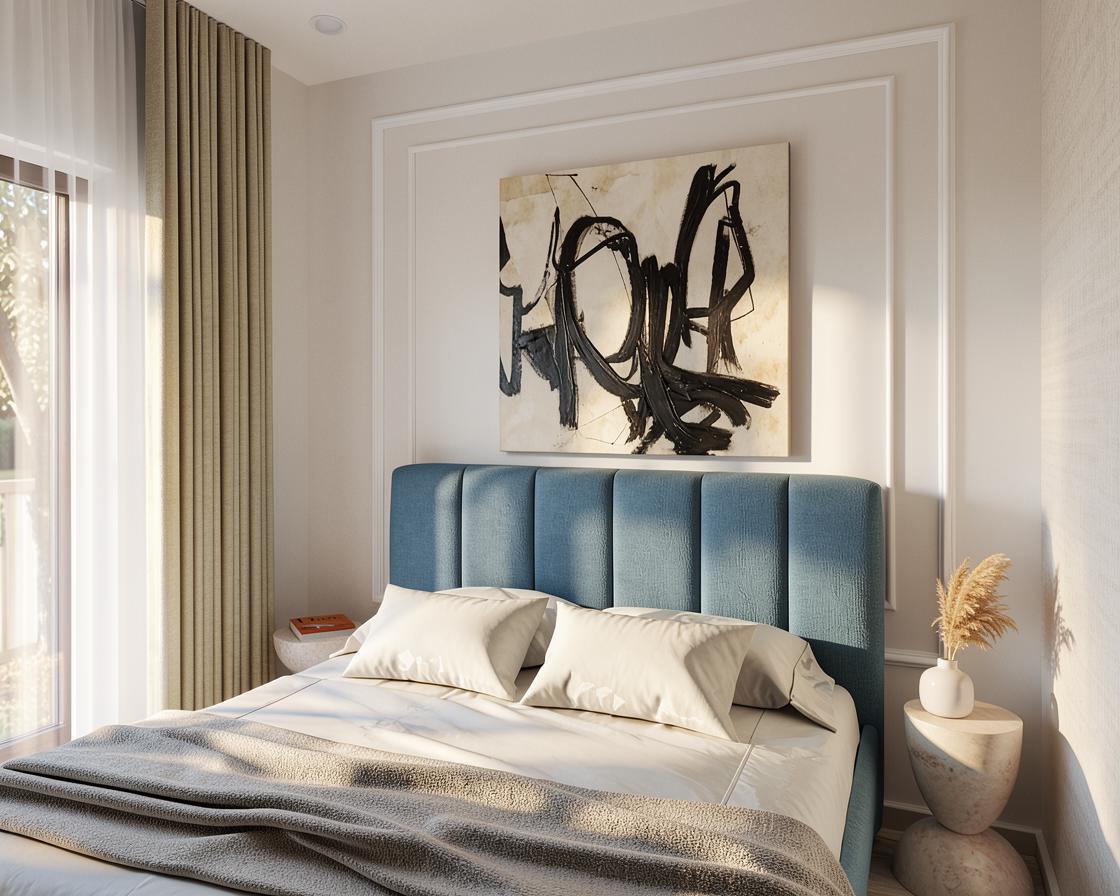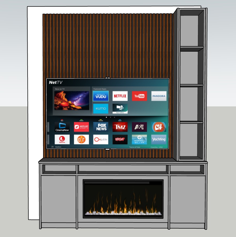 this is a tv unit with an electric fire cabinets open shelves and acoustic panels please render it in a stylish sitting room and keep the colours as they are here