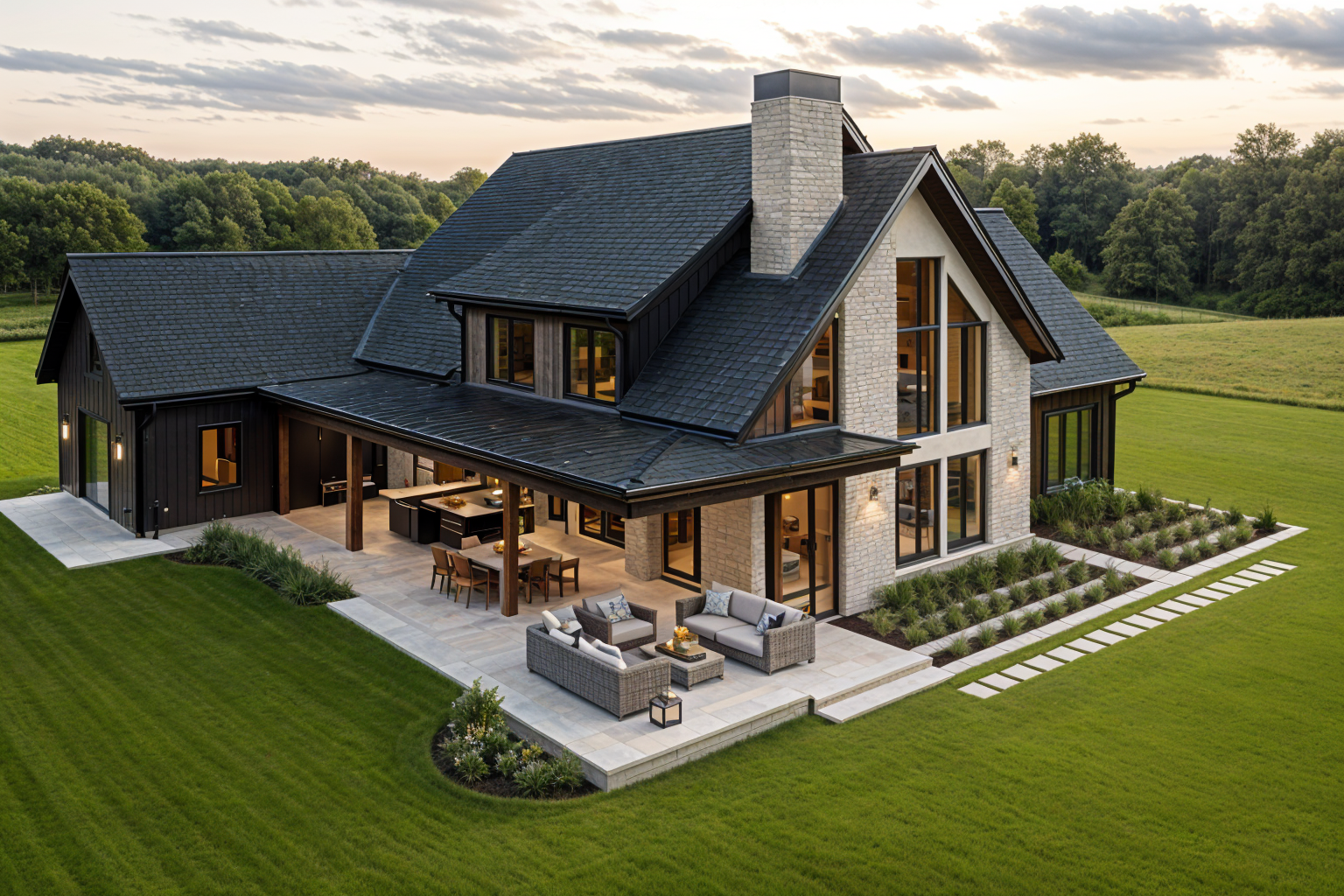 make a super realistic house model add textures on the facade brick wood cladding flowers in the yard