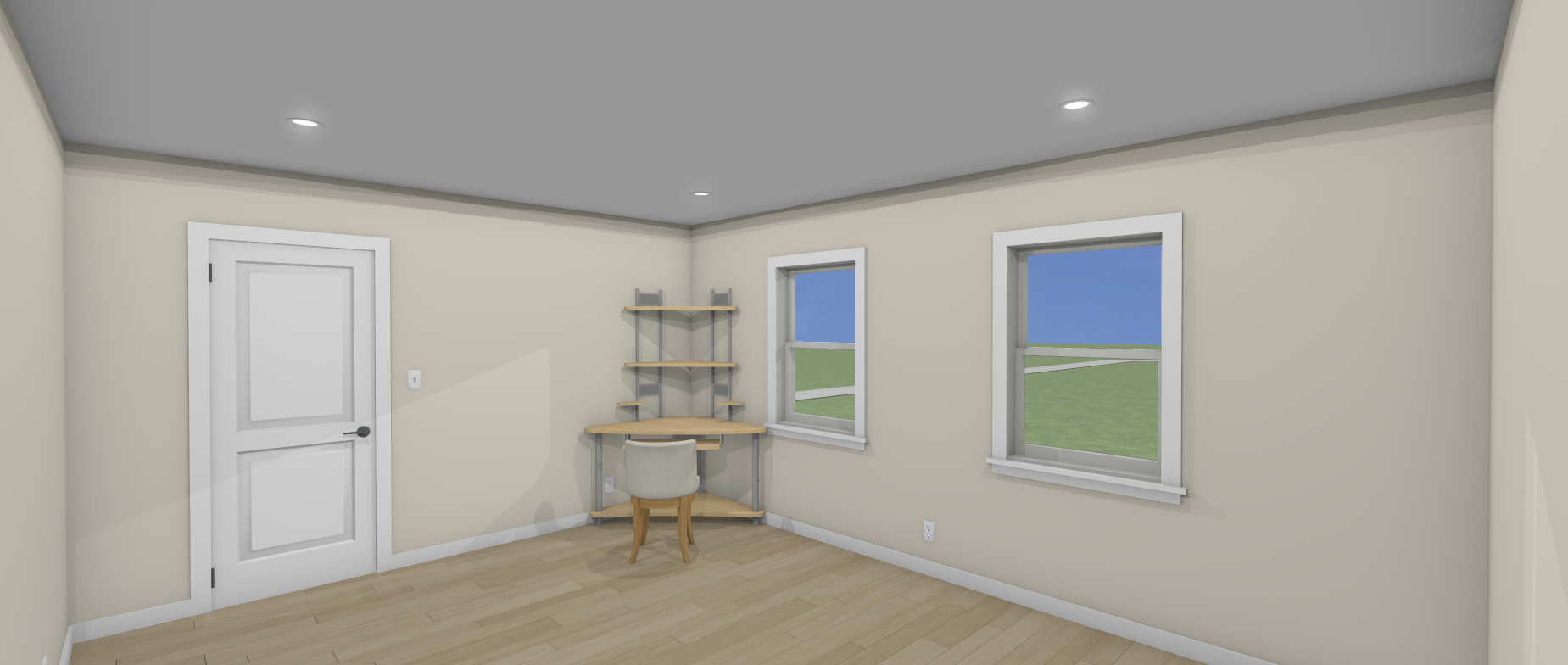 ultra photorealistic high resolution interior render of a 15 12 home office retain all existing architectural features furniture dimensions proportions and camera perspective exactly as shown in the reference image including wall layout ceiling height recessed ceiling lights crown molding wall color baseboards door size and location window size and trim light wood plank flooring pattern and scale and the existing corner office desk and chair with integrated shelving no resizing repositioning or replacement of any existing elements enhance the existing corner office desk only by adding proportionally scaled office accessories that fit naturally within the current workstation footprint dual monitors or laptop with external monitor keyboard mouse desk lamp small desktop organizer notebook pen holder compact speakers and neatly managed cables use the built in shelves above the desk for a few books document binders and minimal d cor appropriate for a functional office optionally add one or two compact space appropriate office items that do not alter circulation a slim under desk filing cabinet or small printer placed adjacent to the desk sized correctly for a 15 12 room avoid clutter and do not add additional desks or large furniture modify only the exterior view visible through the windows replace the background with a lush green forest setting dense foliage and trees with bright sunlight filtering through branches creating soft natural daylight and realistic interior light interaction window frames glass and trims remain unchanged use physically accurate materials realistic wood and fabric textures soft global illumination accurate daylight balance subtle shadows neutral color grading and professional architectural visualization quality 8k resolution photo realistic realism no stylization no architectural changes