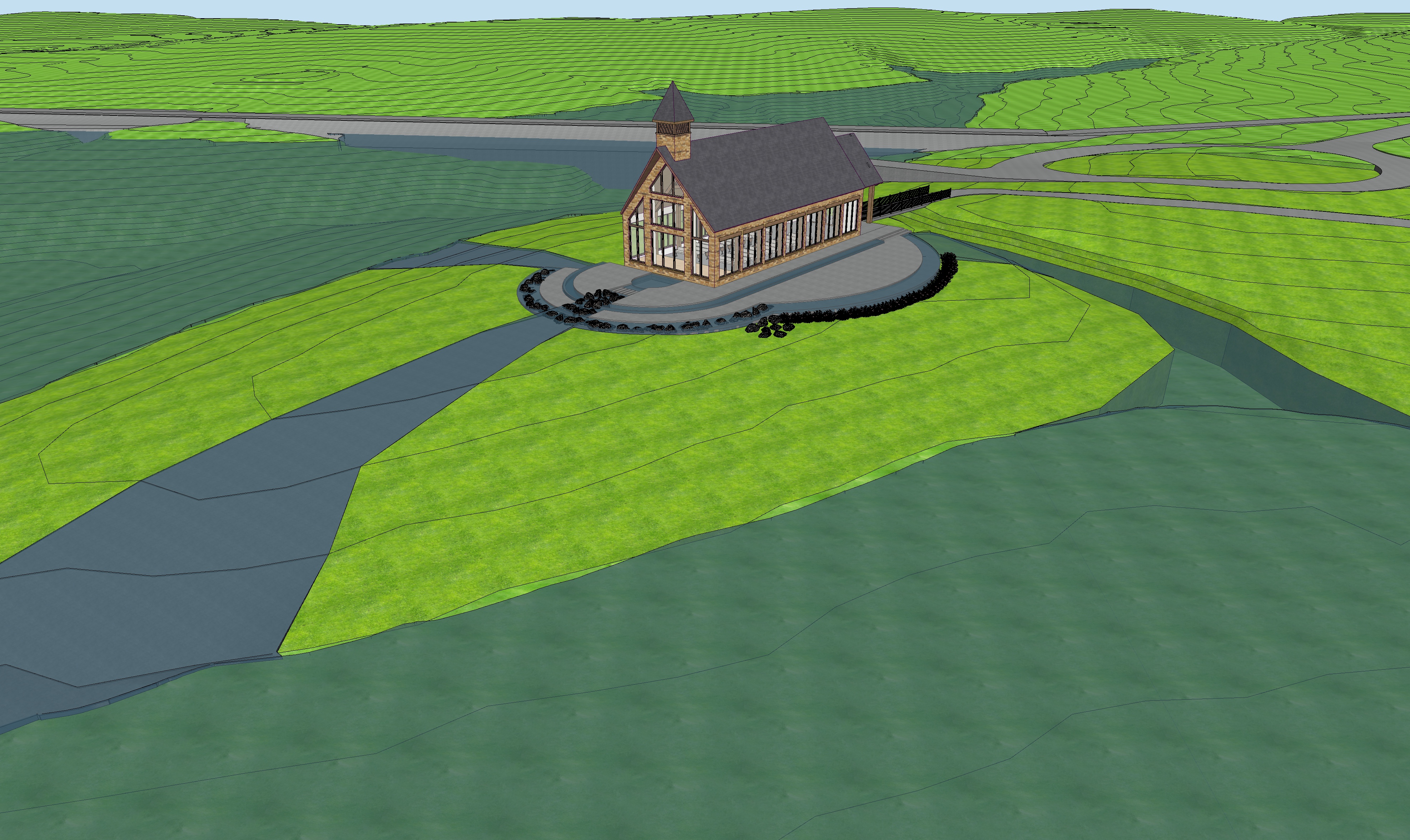 use rendering design this is a small chapel located in southern oklahoma on a lake the walls are oklahoma stone with patios around it in blue stone with waterfalls around the patios there is a small bridge on the back with wood handrail this is in a large wooded area add a few clouds on a sunny day