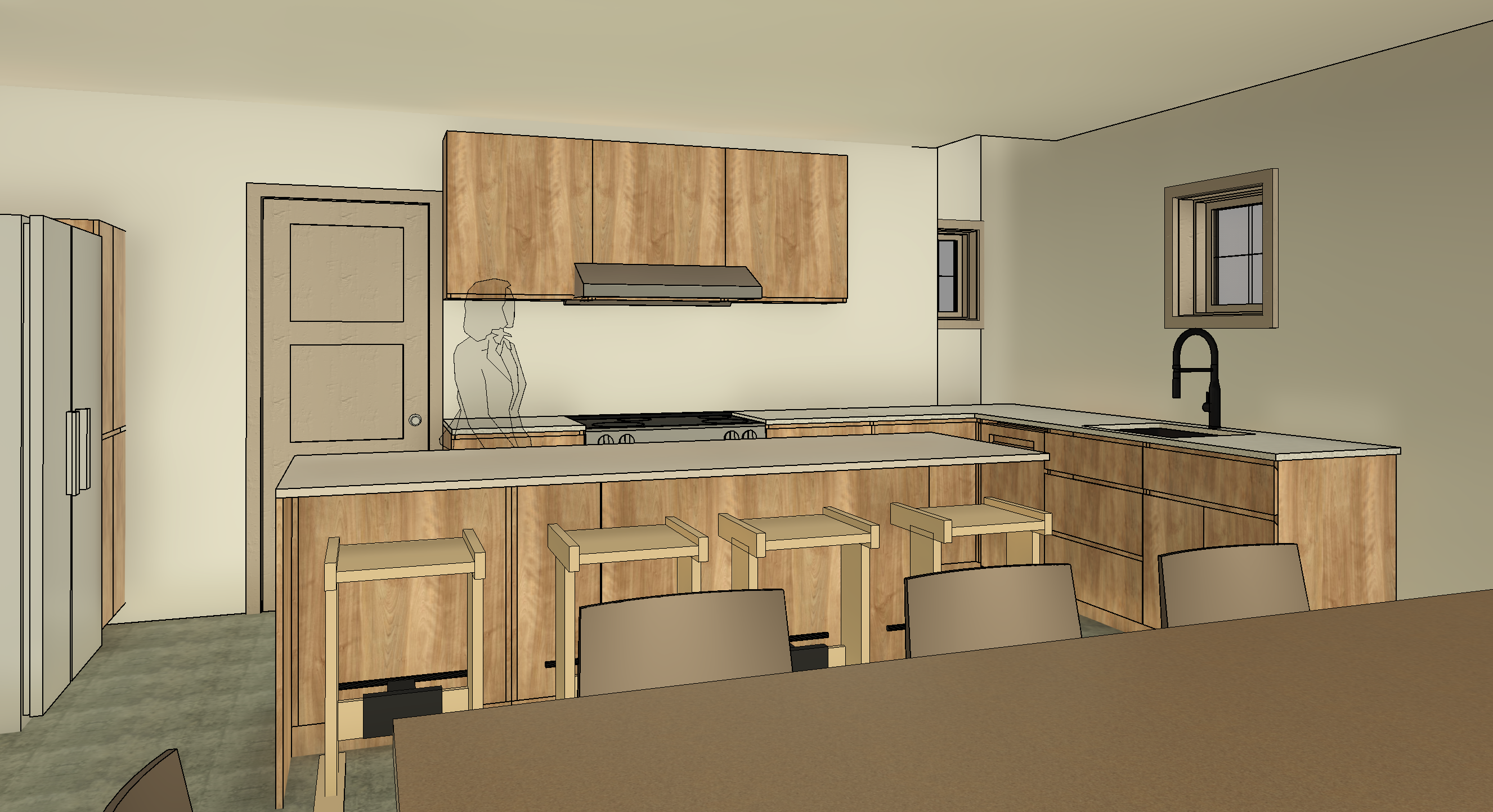use the uploaded revit 3d view as the exact base reference do not change camera position or focal length perspective or crop any architectural geometry walls floors ceilings windows doors cabinetry layout proportions or placement joinery shapes or alignment preserve exactly all linework alignment edges corners and openings spatial proportions and ceiling heights style high end kitchen inspired by kelly wearstler bold sculptural refined layered materials material palette warm natural stone calacatta marble or travertine with strong veining mixed metals aged brass brushed stainless accents soft neutral lacquered cabinetry areas of dark wood or smoked oak for contrast statement stone island with thick edge profile detailing integrated appliances minimal or concealed hardware thick countertops refined junctions and clean joins styling editorial curated minimal clutter ceramic vessels fruit bowl sculptural decor subtle lived in feel lighting soft natural daylight warm ambient interior lighting gentle shadows no harsh contrast render style ultra realistic clean calm architectural high end magazine quality monocle editorial aesthetic balanced tones not overly dramatic negative no redesign no geometry changes no moving elements no extra furniture unless specified no clutter no hdr exaggeration strictly maintain original revit geometry any deviation is incorrect