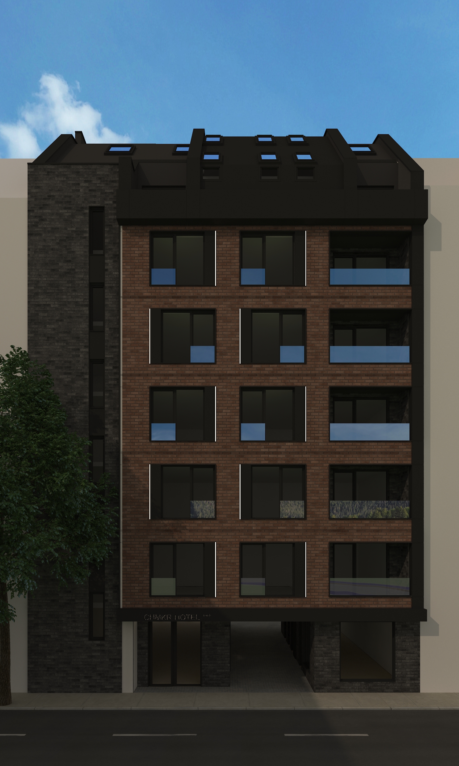 add warm light inside the rooms add curtains time of day dusk add moving blurred car passing make the image 30 lighter with more detail in the bricks vertical lines next to the windows are lights keep the dark bricks color