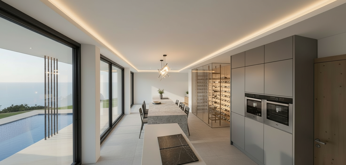 indirekte beleuchtung anders nur um den weinraum oben und an den kochschr nken in der k che kochinsel mit einer kochplatte in einer achse mit dem esstisch esstisch mit einer steinplatte weinschrank schmackhafter gro formatigen fliesen matt
