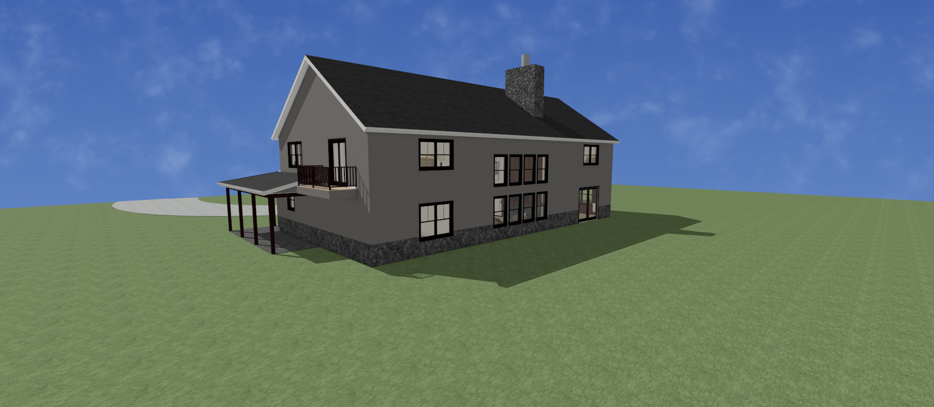 create a high resolution photo realistic render of this rear elevation of a two story farmhouse style home preserve all architectural dimensions proportions and details exactly as shown the gray vertical siding dark trim stone foundation black framed windows chimney with stone texture balcony with dark railing walk out lower level windows and the covered porch supported by posts maintain the exact roof geometry and overhangs as well as the slope of the terrain place the home in a lush dense forest setting surround the property with tall trees and greenery add warm sunlight shining through the branches creating realistic beams of light soft highlights on the siding and roof and natural shadows cast across the ground and the house ensure the lighting materials and textures appear fully photo realistic while keeping all features identical to the reference image